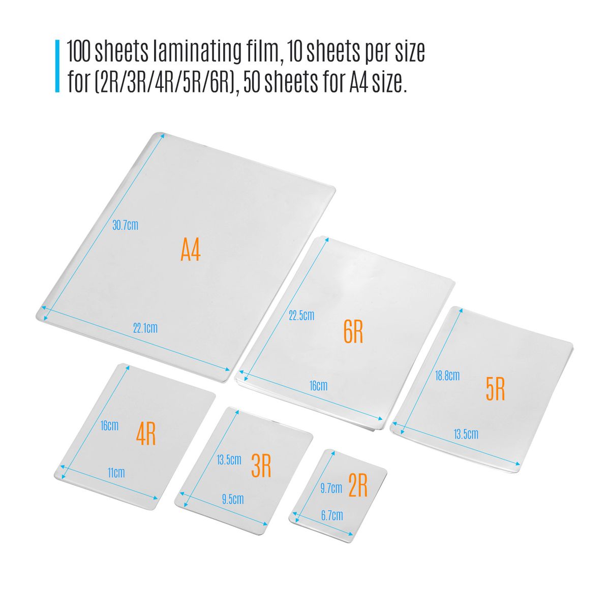 Total 100 sheets laminating film, 10 sheets per size for (2R/3R/4R/5R/6R), 50 sheets for A4 size.