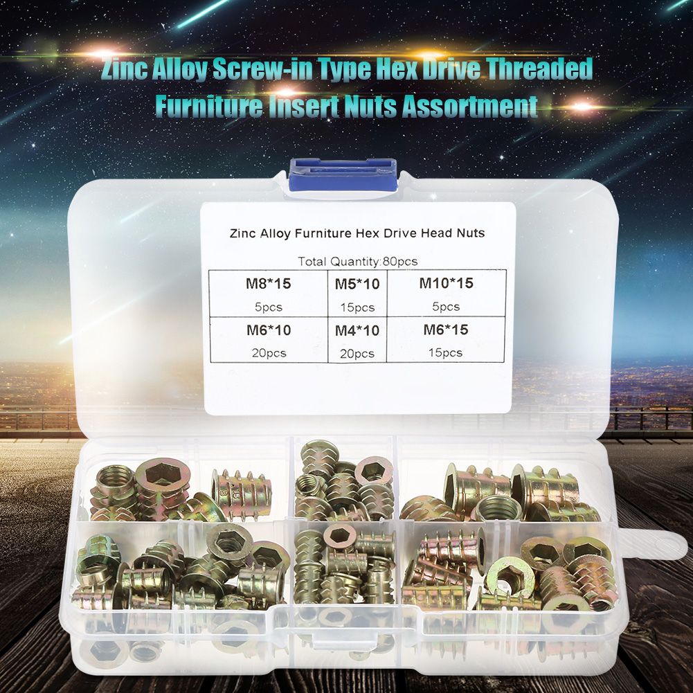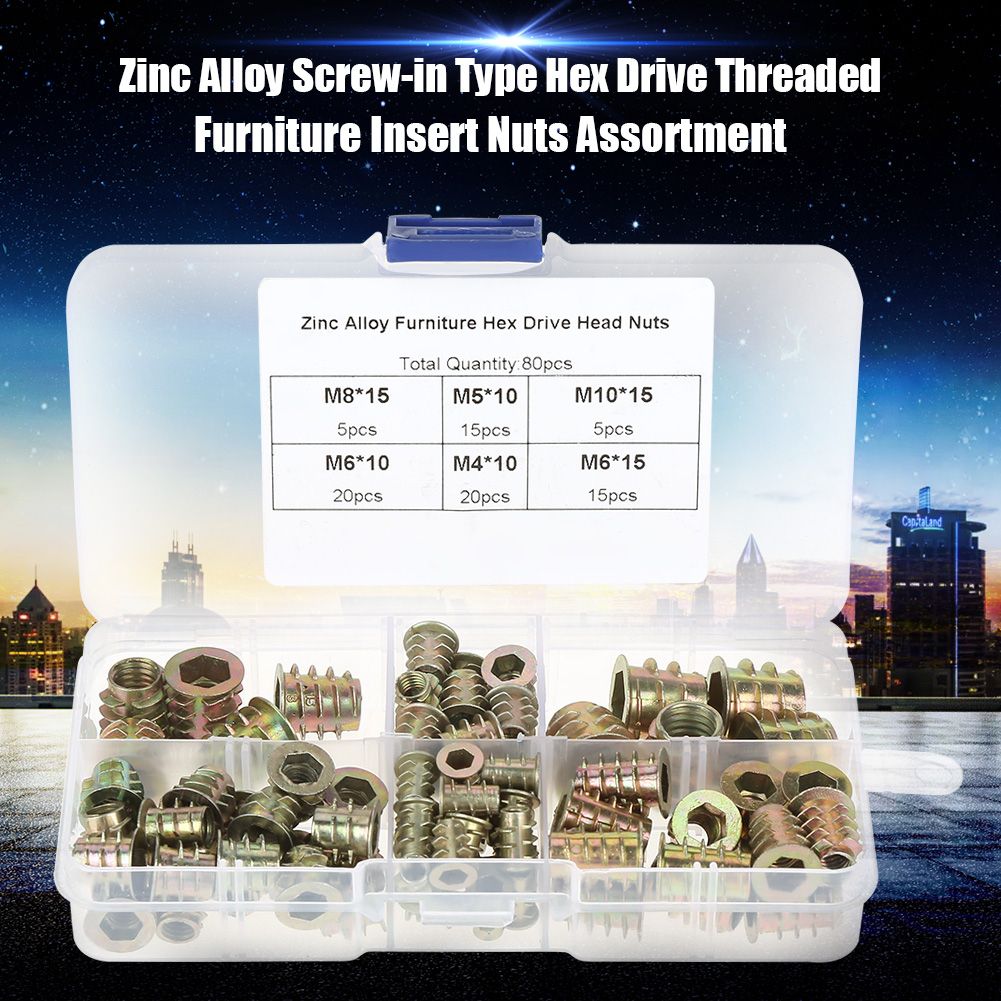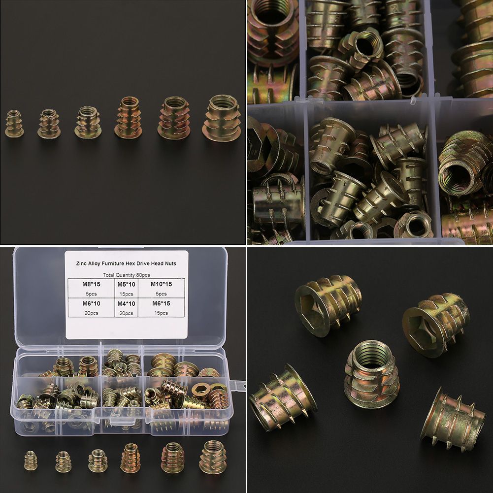 Features:These insert nuts are made from high quantity zinc alloy and comes in a resealable transparent plastic box.