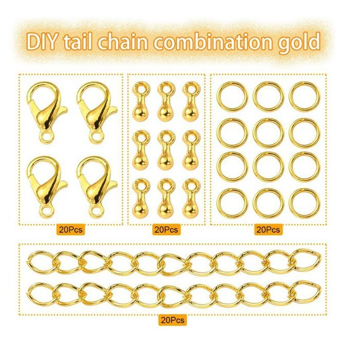 Package: The jewelry making diy accessories including 20x open jump ring, 20x lobster claw clasp, 20x extender chain, 20x chain drop ends.