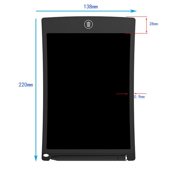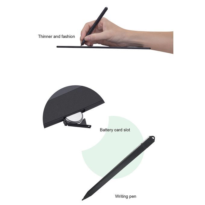 thank you for purchasing the products in our store. we hope to give you a pleasant shopping experience.Color: BlackMaterial: ABS frameFont: color fontProduct size: 22*13.8*0.9cm(8.2 ")Display: 8.2 inch color LCD screenInput pressure: 100-200gReflectance: 25%-30%Power mode: a built-in CR2025 button batteryCleaning: please wipe gently with a soft clothFunctions: writing, drawing, one - click delete, color font Suitable for many occasions, light weight, easy to carry, reusable.The product supports one button lock screen, one button clear screen function and low power consumption.The use of the product is very convenient, no need for ink, energy saving and environmental protection.Products without radiation, harmless to the body, can be used safely.