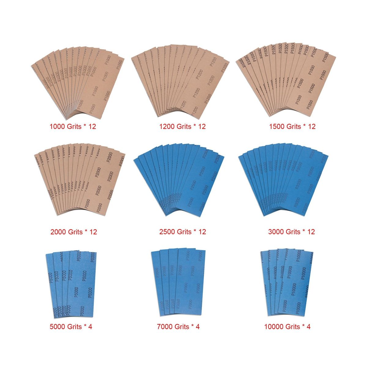 Wet Dry Sandpaper Assortment - 84 pieces wet dry sandpaper in 9 grits, 12 pieces for each 1000#, 1200#, 1500#, 2000#, 2500#, 3000#, and 4 pieces for each 5000#, 7000#, 10000#.