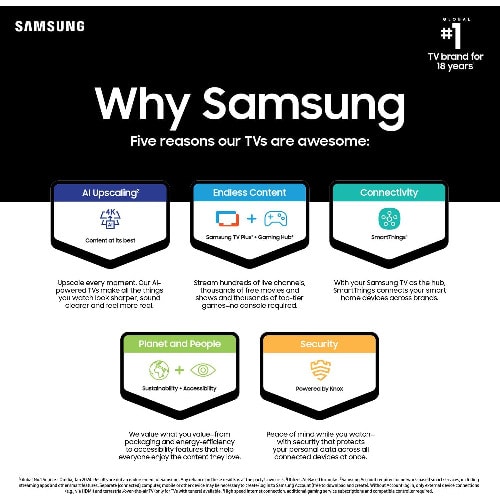 Larger display with minimal bezels. The Samsung TV’s sleek, streamlined design enhances your viewing experience by focusing on the picture quality. Its minimalist, bezel-free design ensures the screen looks impressive from any angle.