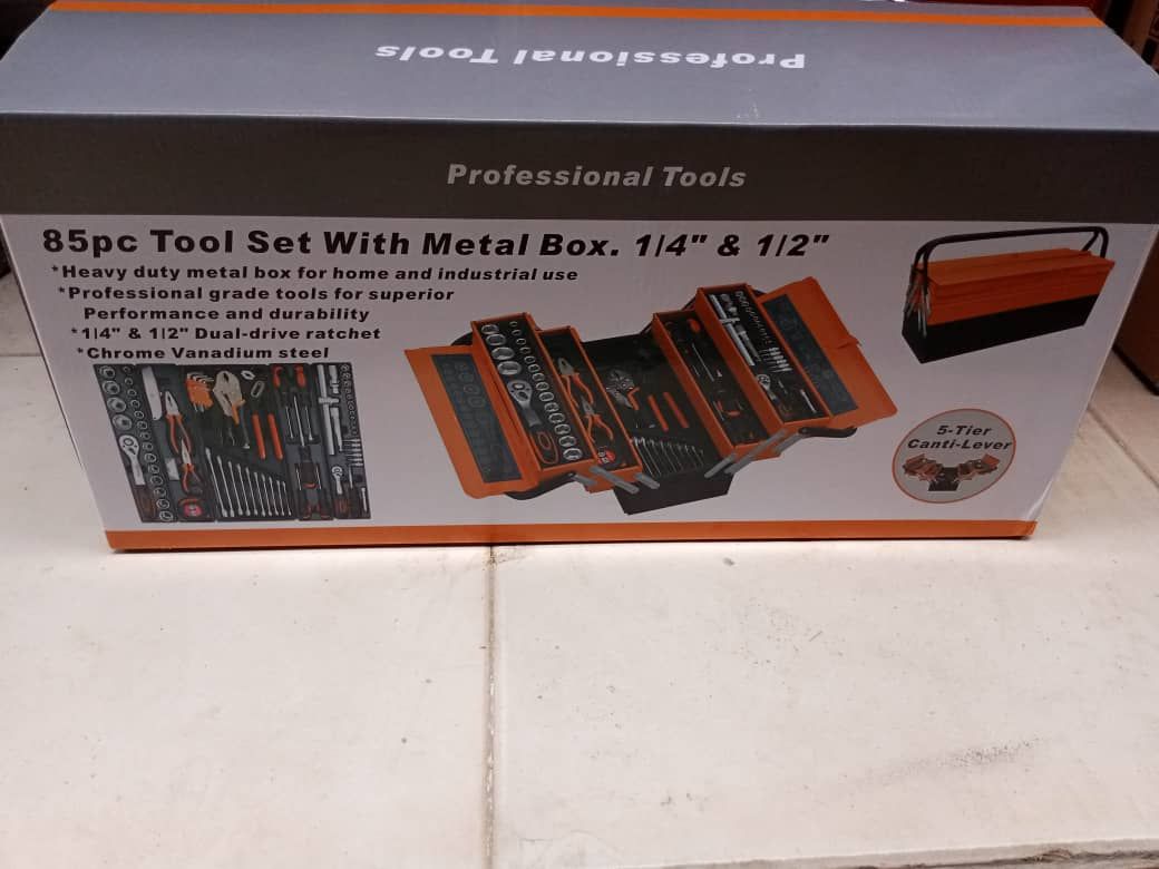 Have every odd-job and task around your home covered with theCantilever Tool Box. This comprehensive metric tool kit comes with a huge assortment of practical tools ranging from sockets and pliers to hex keys and a handy screwdriver. Made from high-quality chrome vanadium, these are dependable and enduring tools that perform to an exceptional standard. The box itself is built with a high tensile powder coated steel enclosure to withstand any knocks that may occur during the course of work or transport.The tools are fitted with PVC molded inserts contained in all compartments of the cantilever box. Each compartment opens out at a flat level, which makes finding and accessing each tool a cinch. The pad lockable lid and foldable handles provide security and safety, compact transport. This all-inclusive compact unit contains an incredible 85 pieces and fits discreetly on a workbench or shelf.This toolkit offers an instant collection of quality practical tools suitable for an endless list of DIY jobs. It's the essential addition to maintain any household.Highlights• High tensile powder coated steel enclosure