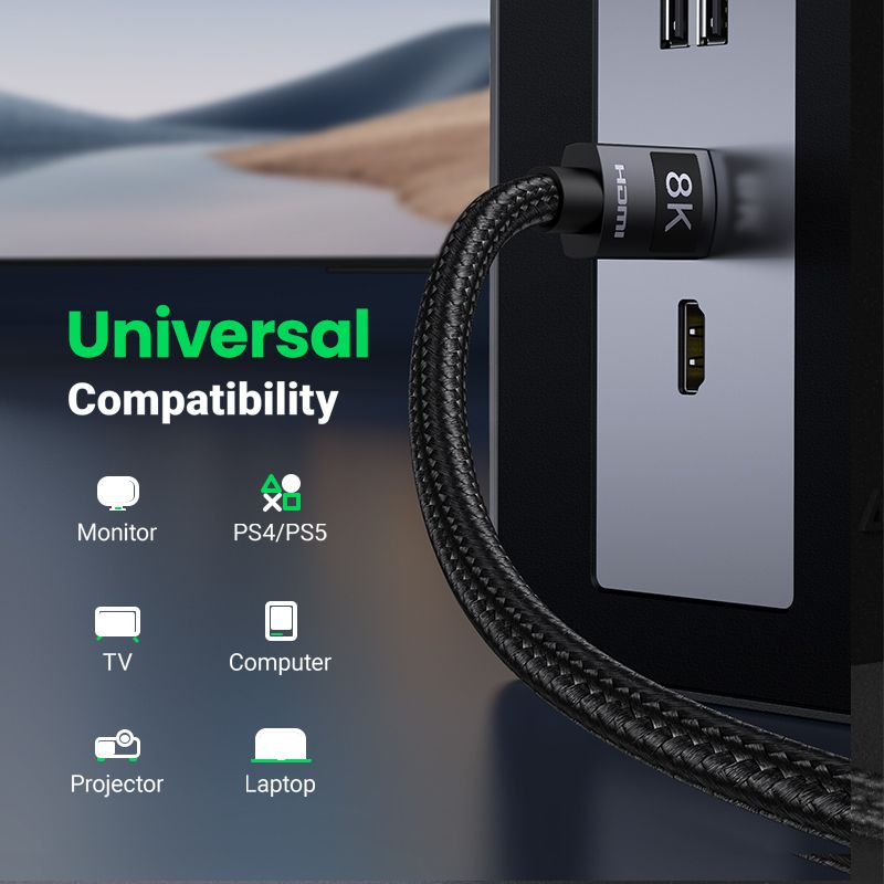 Broad Compatibility: UGREEN high speed 8K HDMI 2.1 Cable compatible with PS5/PS4/PS3, NS switch, Xbox Series X, laptop, Fire TV, Blu-ray player, AV Receiver, Laptop, DVD, HDTV, eARC soundbars and other display.