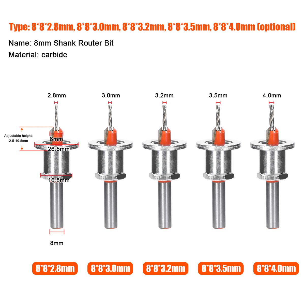 This 8mm shank router bit is made of strong carbide material, it has high strength, high hardness, wears resistance, and fine durability. The 2.5mm-10.5mm height adjustable drilling core is designed for quick holes opening. Suitable for drilling on pine wood, solid wood, density board, shaving board, medium-density fiberboard, etc. Easy cooperating with flat-edges trimmers, electric routers, vertical carving and milling machines, automatic engraving machines, etc.