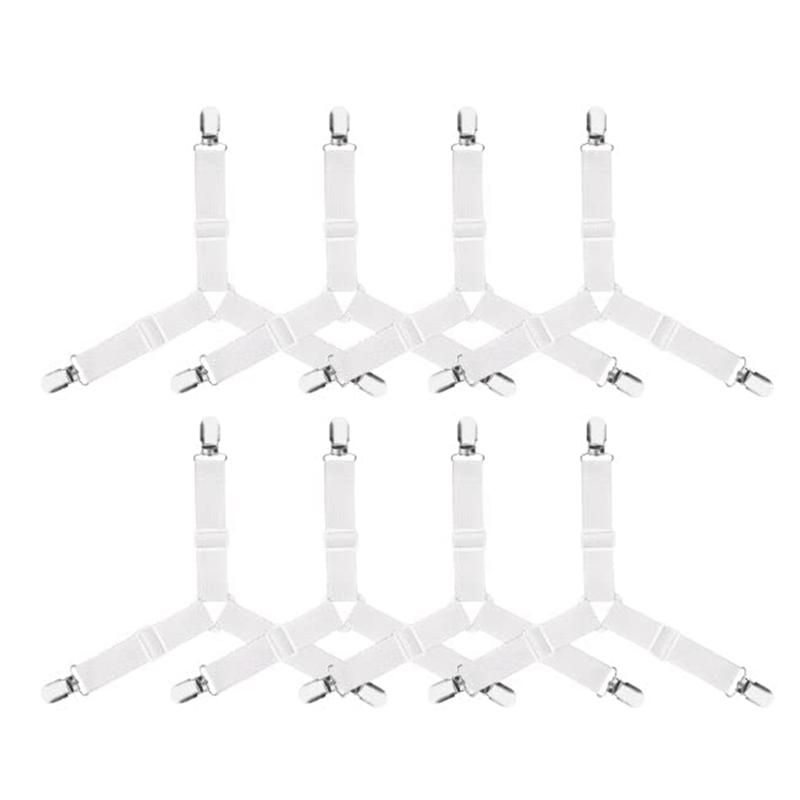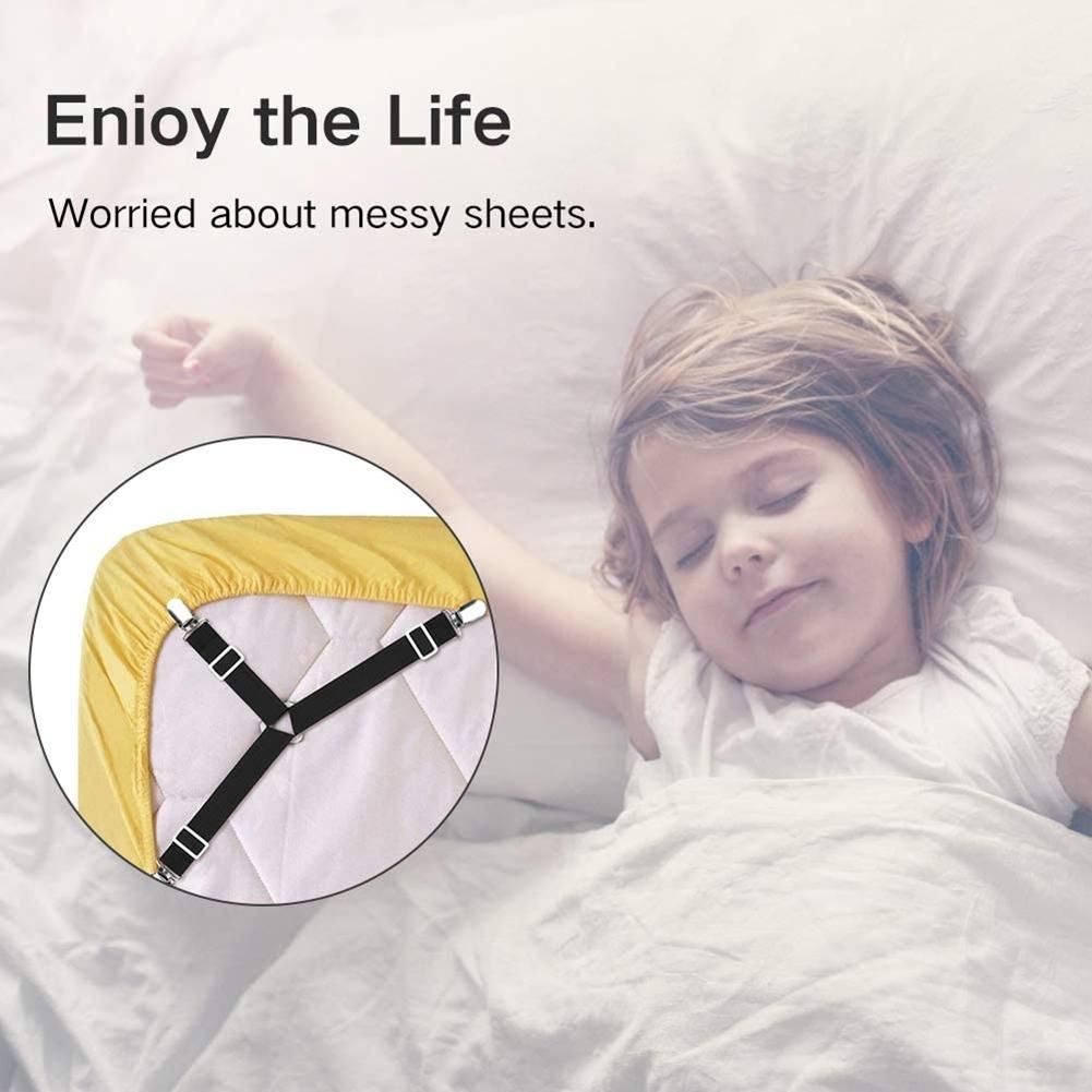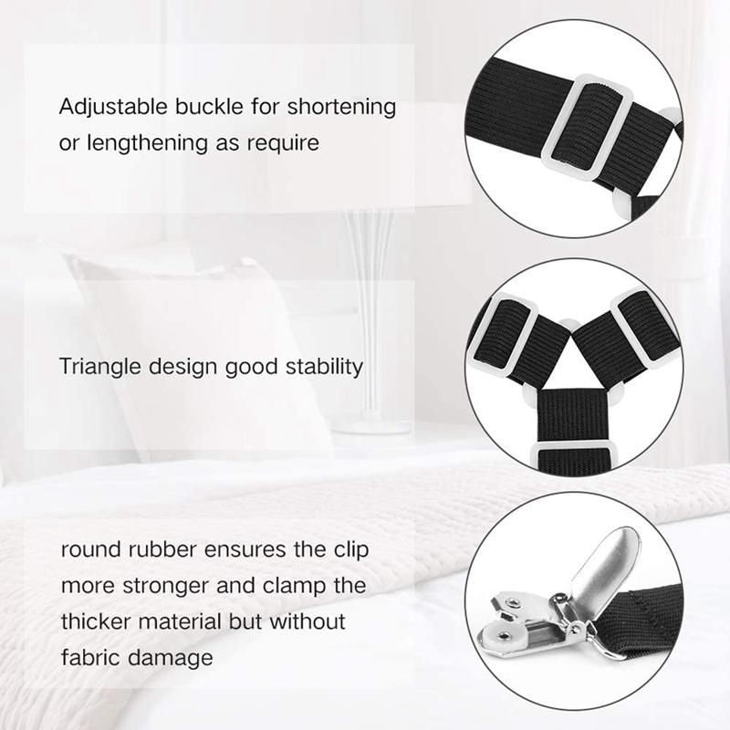 HIGH QUALITY MATERIAL This Bed Sheet Fasteners are made of sturdy chrome metal clips and heavy duty elastic bungee that will grip your bed sheets firmly Easy to put on and keeps sheets in p and no more fixing sheets adjustable length allows tension Triangle which avoiding the elastic sliding all the time
