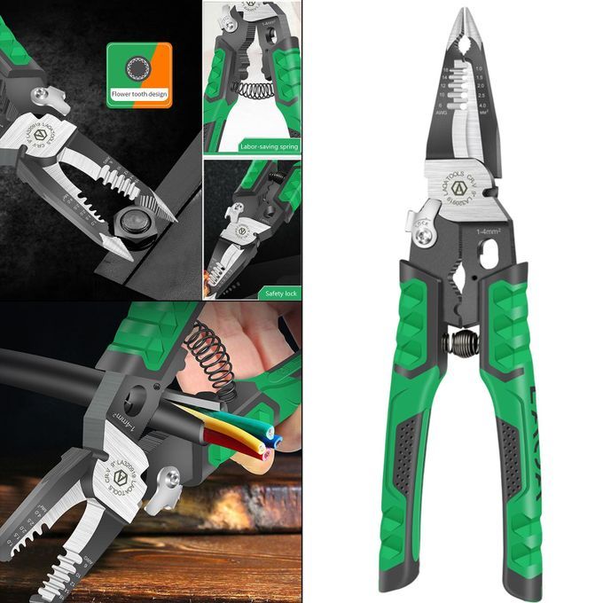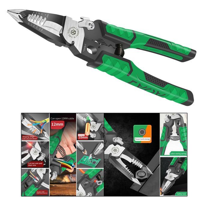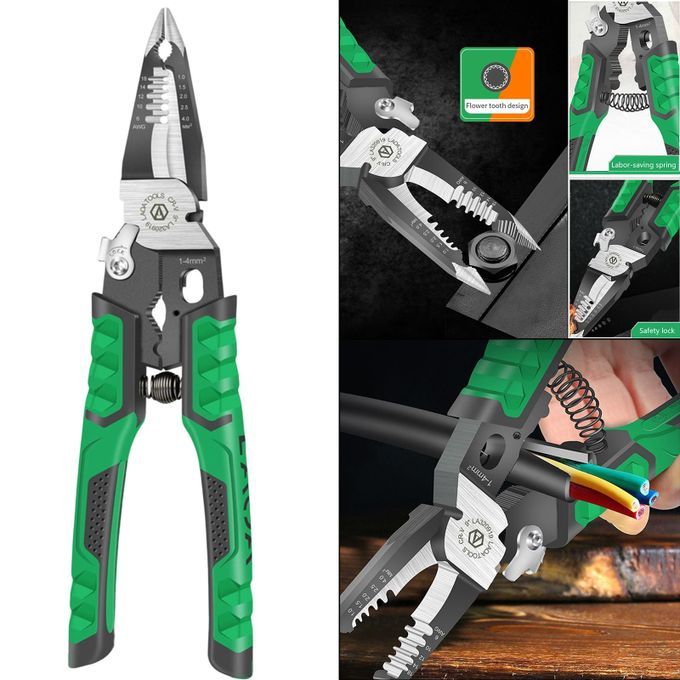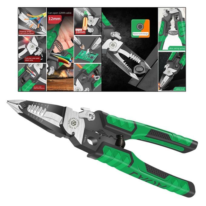 Dear customers, welcome to my store. We are an online store where you can purchase all your electronics, home appliances, kiddies items, fashion items for men, women, and children; cool gadgets, groceries, automobile parts, and more on the go. Our store is a star store dedicated to creating high-quality and practical products, allowing you to enjoy a better lifestyle. Your support is our greatest driving force. All the goods in our store are sold at the lowest price, and the quality is guaranteed. If you need it, please rest assured to buy, we will provide you with a comfortable shopping experience every time. As well we are launching new products every day, please follow our store and pay more attention, you will get the information of our latest products as soon as possible. Clicking on the seller information to enter our store to buy what you needs, after placing an order, we will deliver the goods for you at the frist time. Thank you and have a nice day!Description:9 in 1: Multifunctional design, which integrates clamping, , wire stripping pliers, wire , wire splitting, and crimping terminals.CRV Material: Electrician Pliers forged with chrome vanadium steel, high frequency quenching hardness reaches 58+-2, sharp and durable.Comfortable Handle: Non slip two color handle, comfortable and beautiful in hand.Stripping range: AWG18,14,12,10,6/1.0,1.5,2.0,2.5,4mm2Application: Suitable for electrician decoration, maintenance, automobile wiring, etc.Specification:Material: Chrome Vanadium SteelSize Chart:full length 215mm/8.46inch