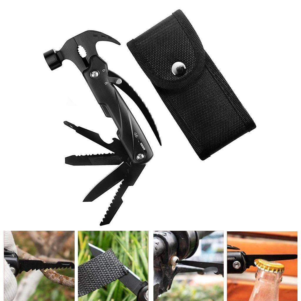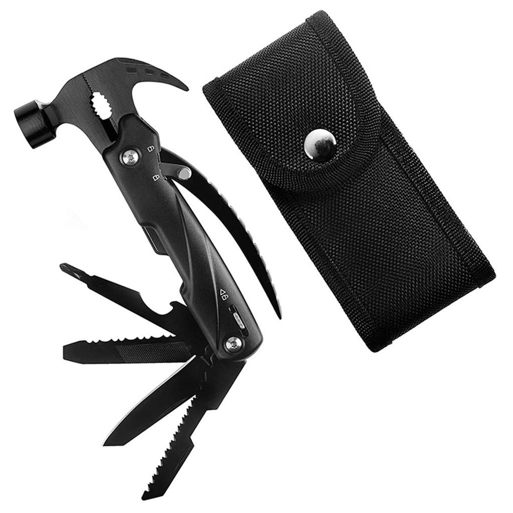 All in One Tools: 9 different tools including a hammer, wrench, nail claw, bottle opener, nail file, , screwdriver storage, , bit mounting hole. This multitool hammer is so handy with non-slip handle for camping.