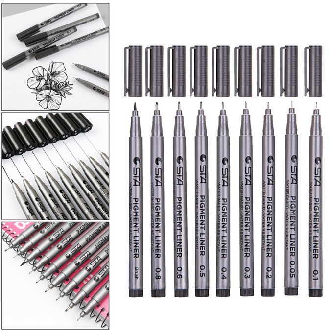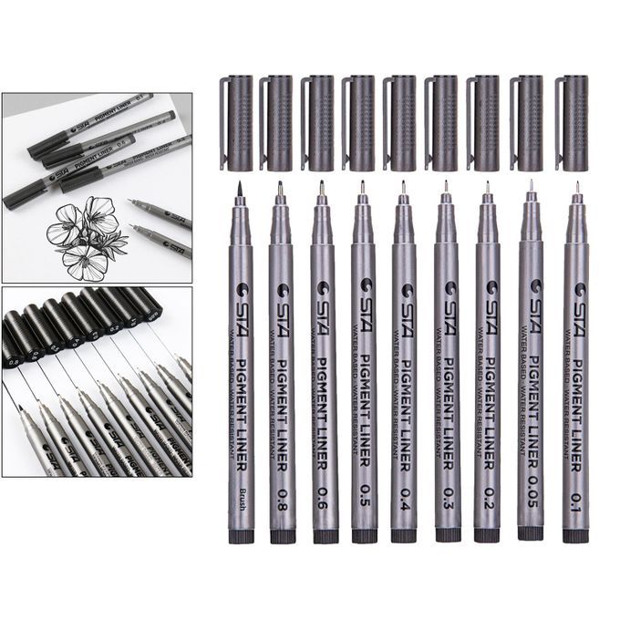 Contains 9pcs pigment liner pens with tips separately in 0.05mm, 0.1mm, 0.2mm, 0.3mm, 0.40mm, 0.50mm, 0.6mm, 0.8mm and brush tip.