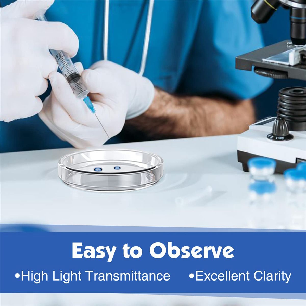 Easy to observethe dish has high transparency and there is no bubble in the glass In you can and clearly observe the sample under the microscope Even after several sterilization it still maintains high light transmittance