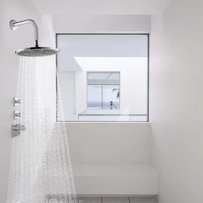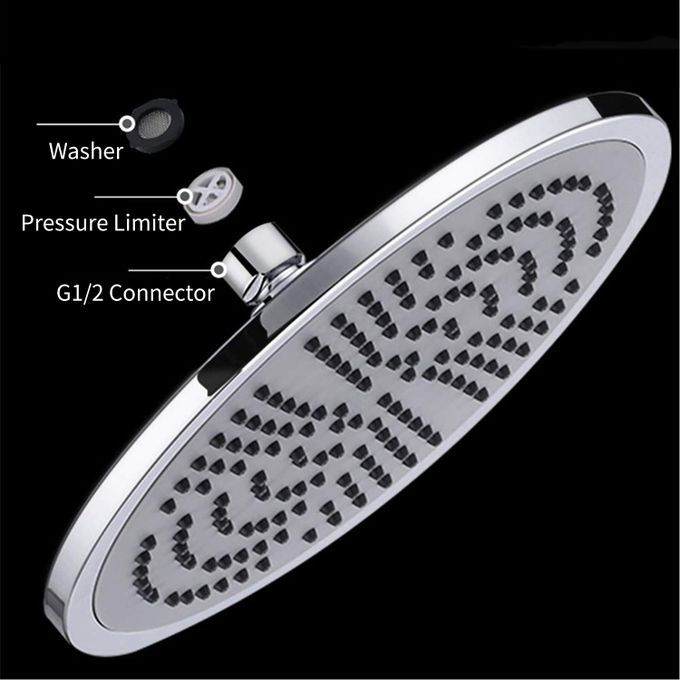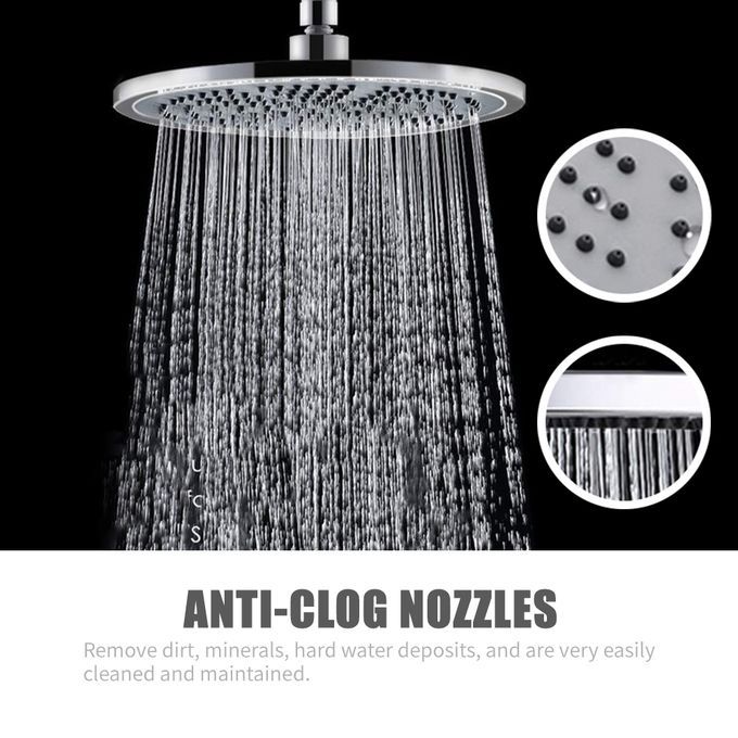 The rain shower head is made of premium stainless steel material and a polished chrome finished, and it is anti-corrosion, rust-proof and durable. Self-cleaning nozzles can stop natural calcium from accumulating to prevent blocking. The high-pressure shower head is designed with the most advanced water-saving, and pressurizing technology, give you a comforting shower experience.
