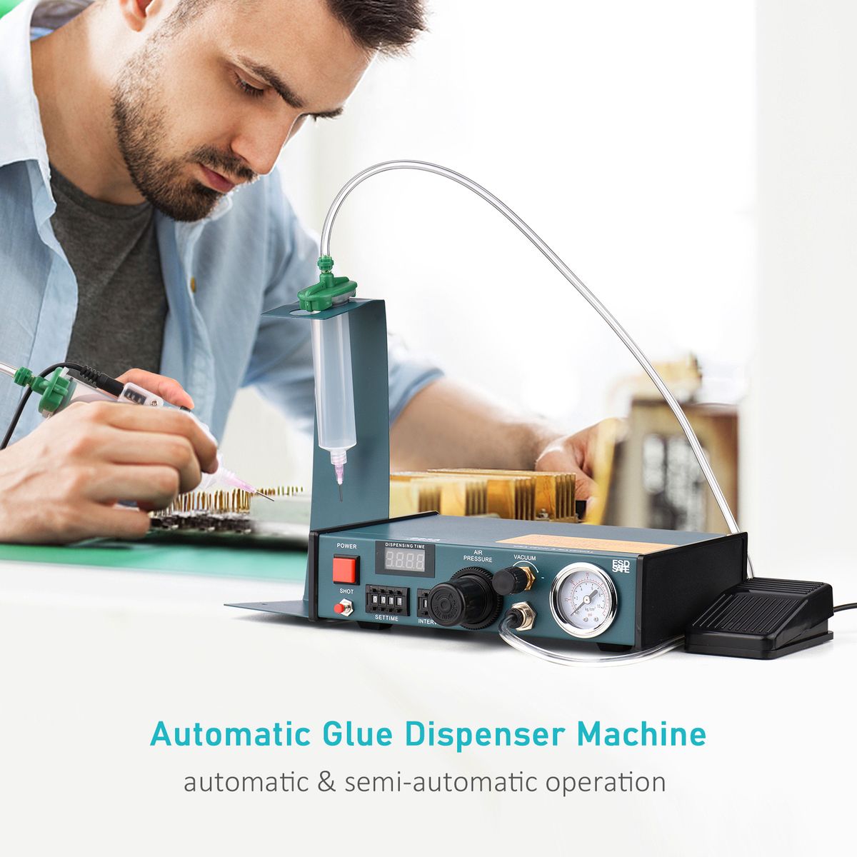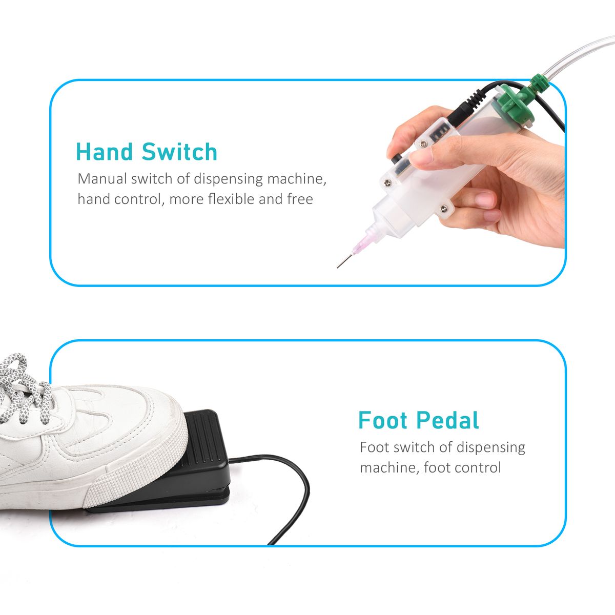 Dual Controlling Modes amp; Switches: automatic amp; semi-automatic mode switchable, and equipped with a hand switch and a foot pedal for control the glue dispensing by hand or foot.