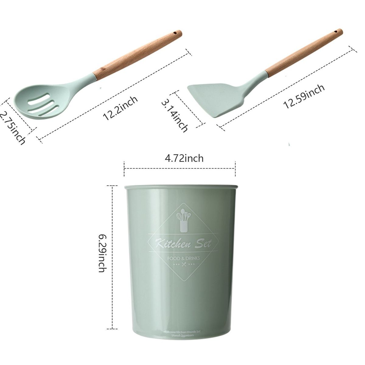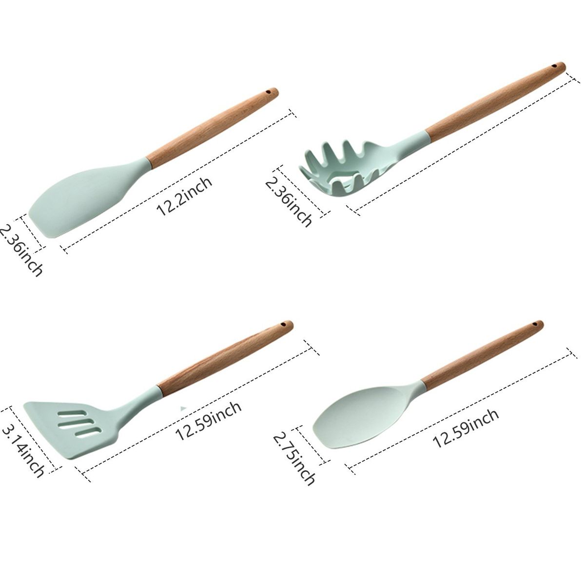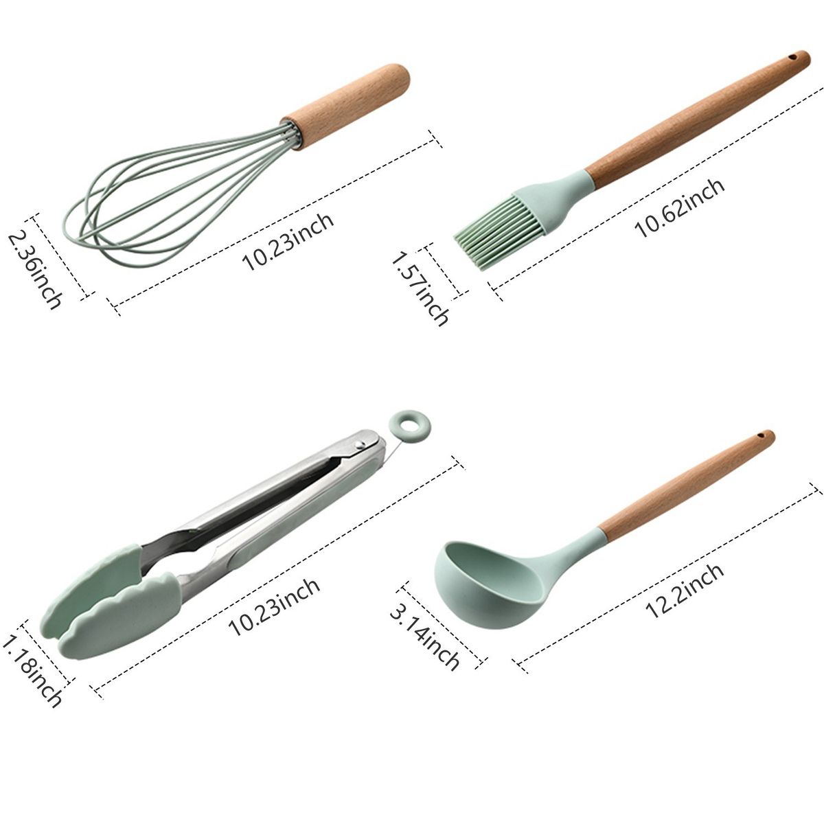 This high-quality non-stick silicone and wooden kitchen tools set means no more melting plastic kitchen accessories. The silicone heads can withstand temperatures ranging from -22 deg;F/-30 deg;C to 392 deg;F/200 deg;C. Their easy-to-grip, comfortable handles, and balanced weight make cooking a joy and their large hanging holes help keep your cookware set orderly and organized.