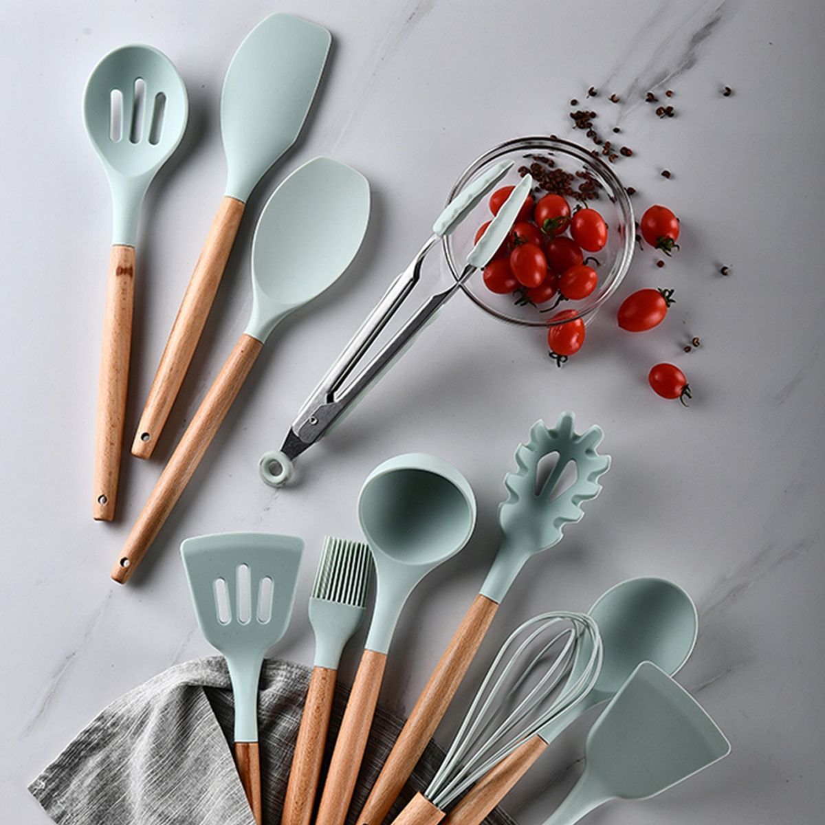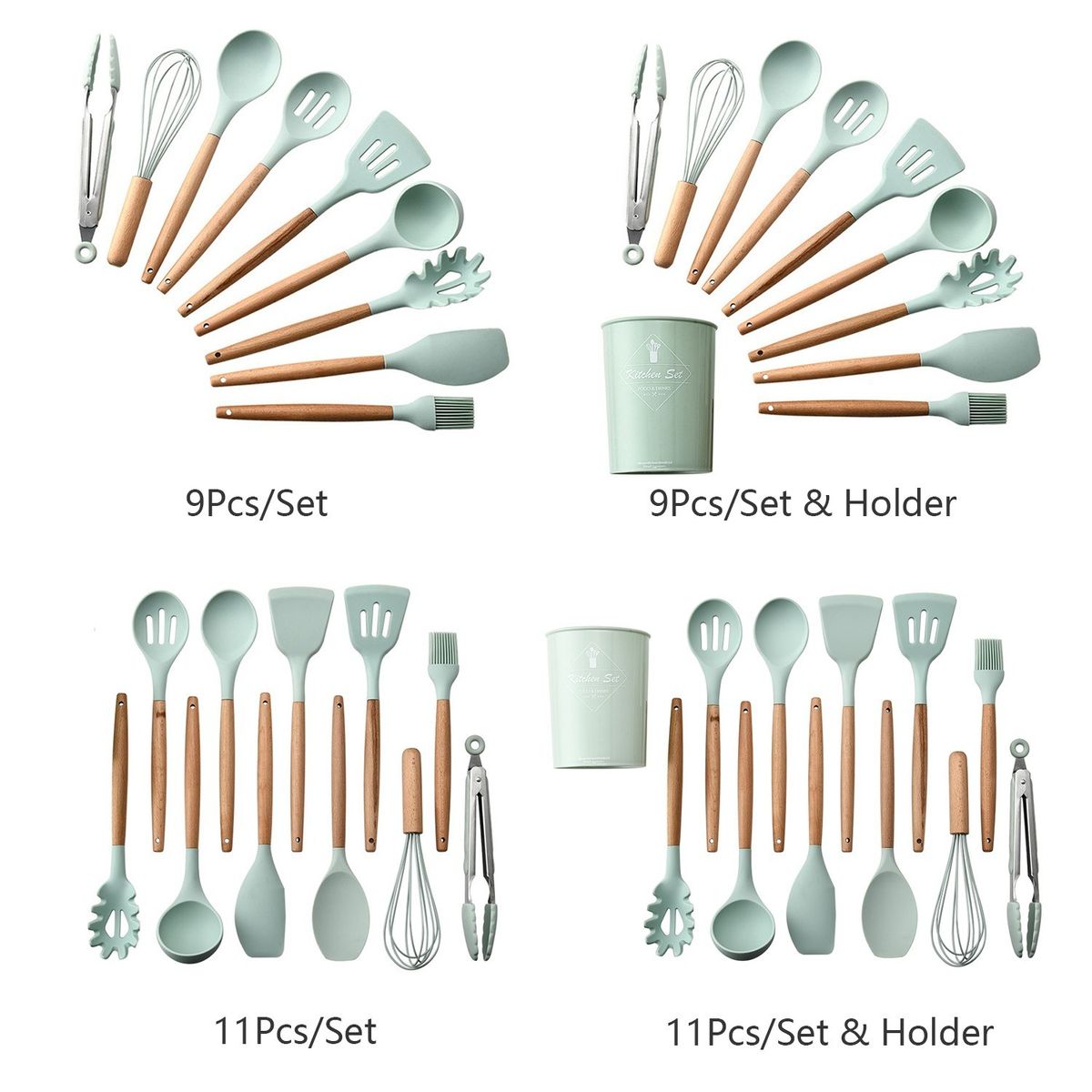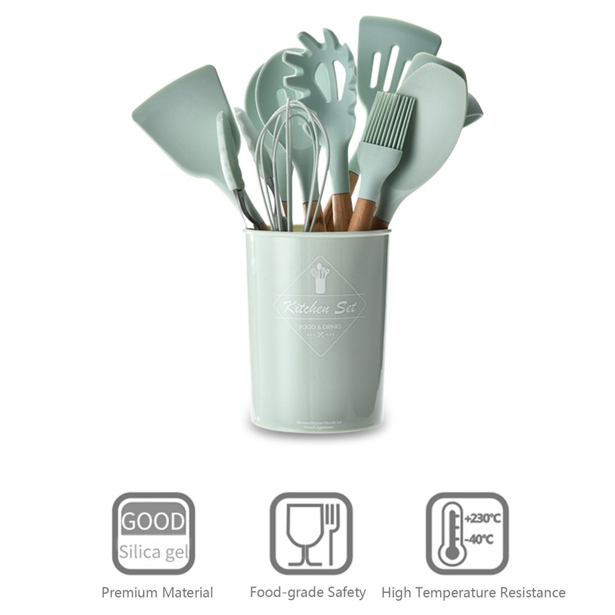This high-quality non-stick silicone and wooden kitchen tools set means no more melting plastic kitchen accessories. The silicone heads can withstand temperatures ranging from -22 deg;F/-30 deg;C to 392 deg;F/200 deg;C. Their easy-to-grip, comfortable handles, and balanced weight make cooking a joy and their large hanging holes help keep your cookware set orderly and organized.