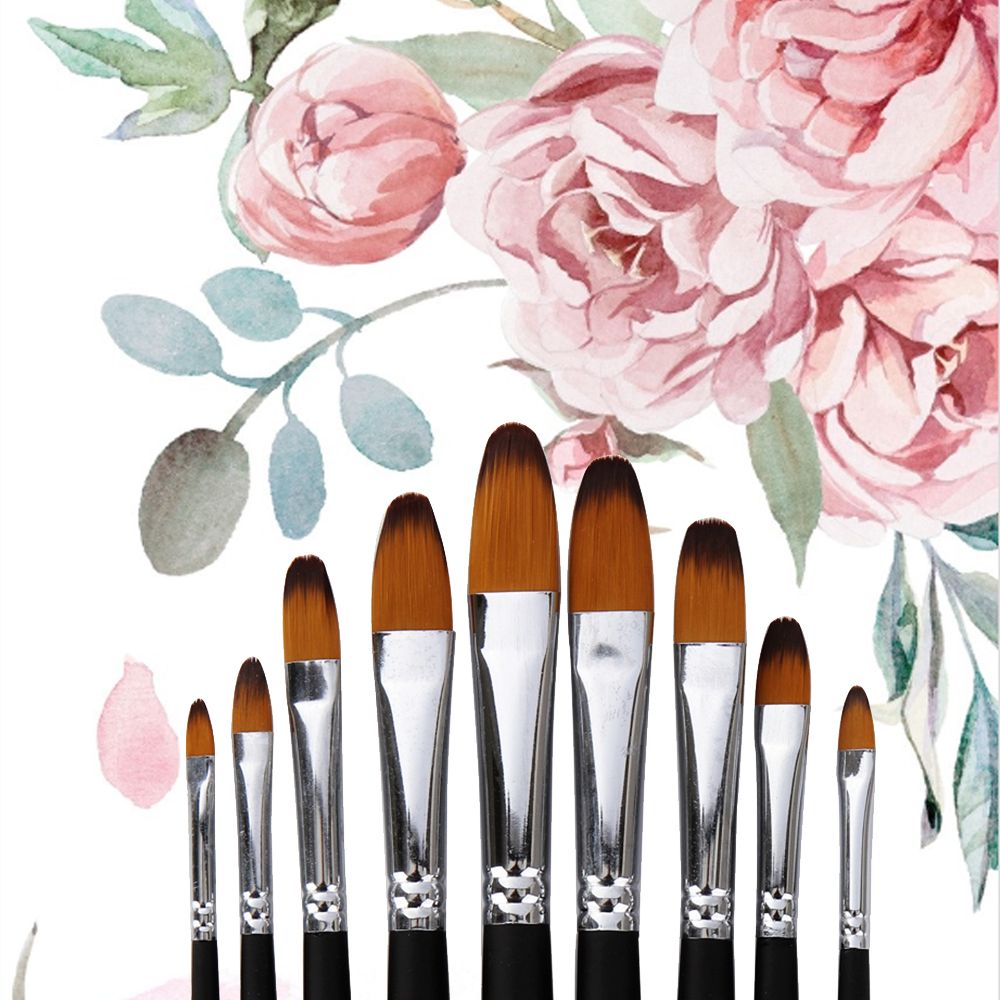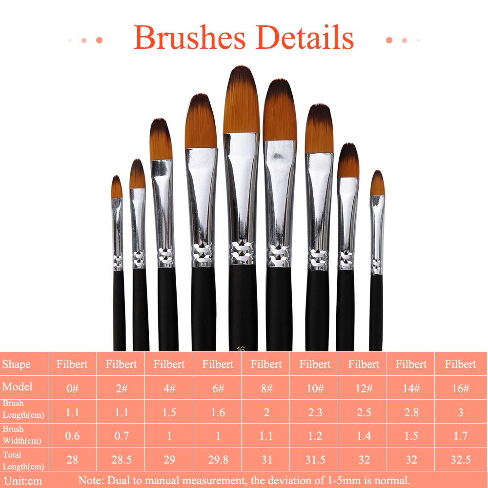 4 paint brush types for option-Round Tip/Flat Tip/Filbert Tip/Angular Tip. 9pcs paint brushes in different size: 0#,2#,4#,6#,8#,10#,12#,14#,16#.