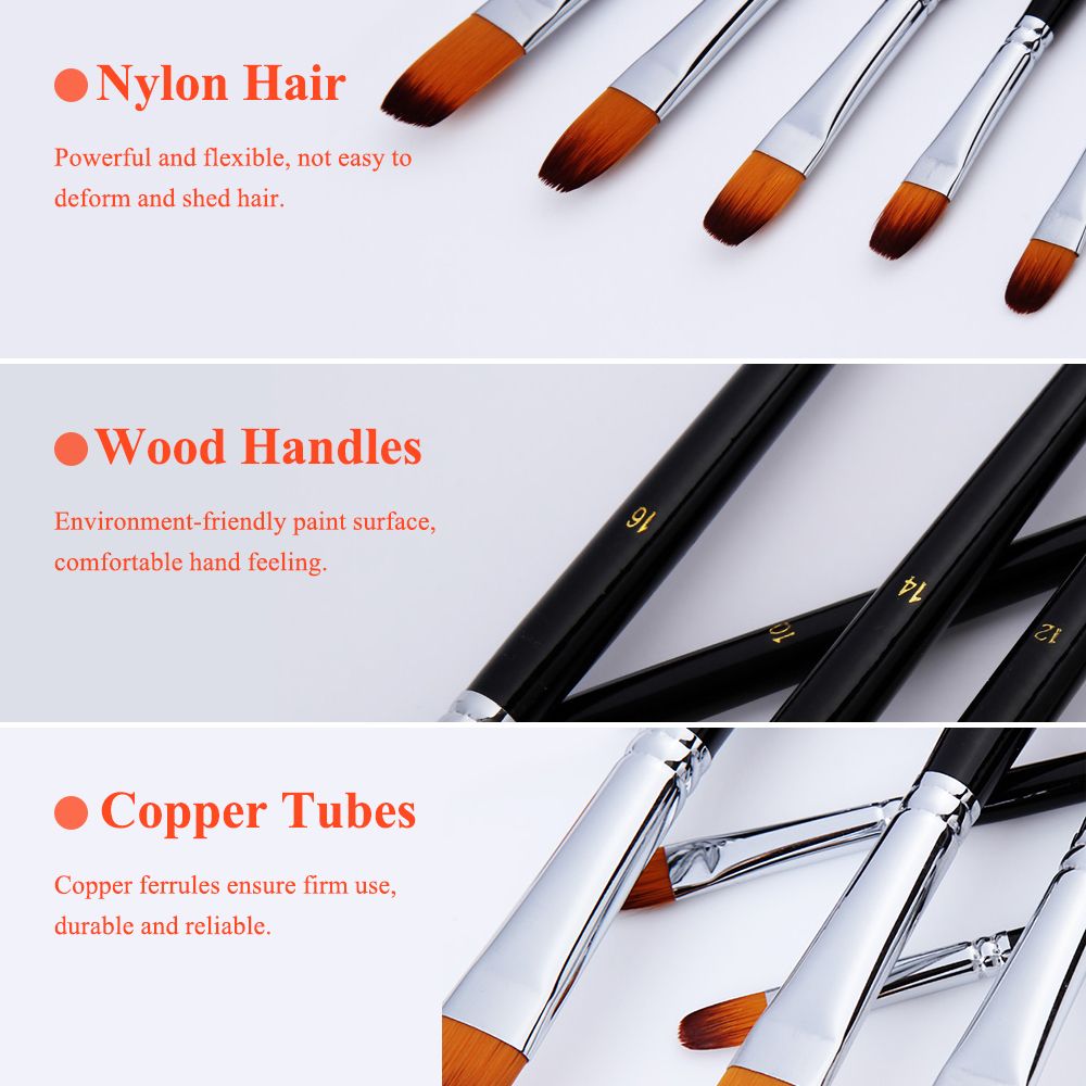 The brushes adopts high quality nylon hair, powerful and flexible, not easy to deform and shed hair, easy to absorb the paints, smooth to use.