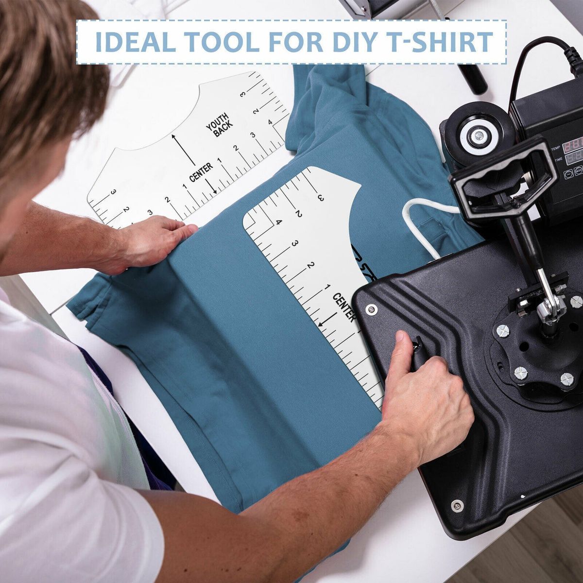 This T-shirt design tool is very useful when aligning your design with the T-shirt, easy to use, just align the ruler to the collar and center the design before pressing it.