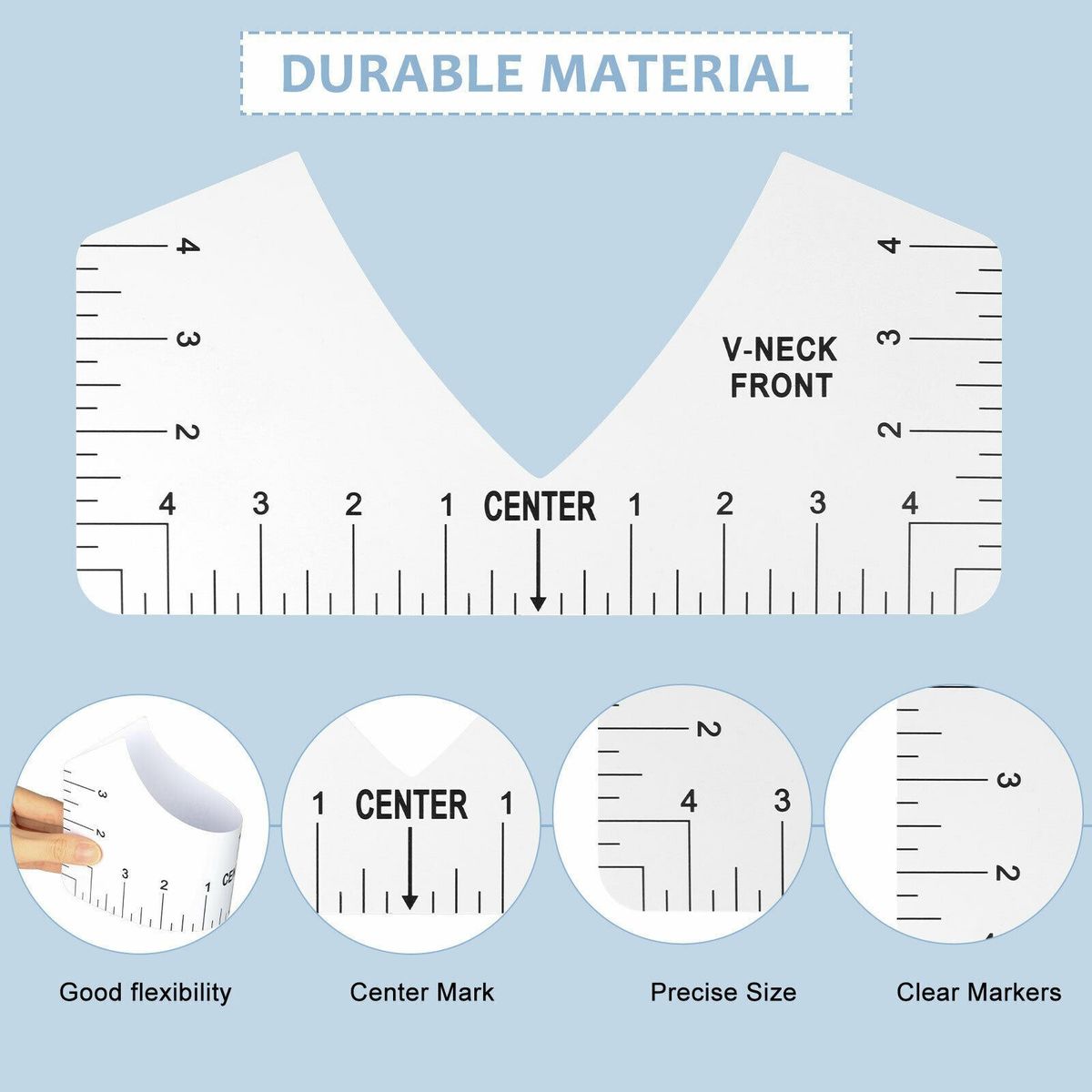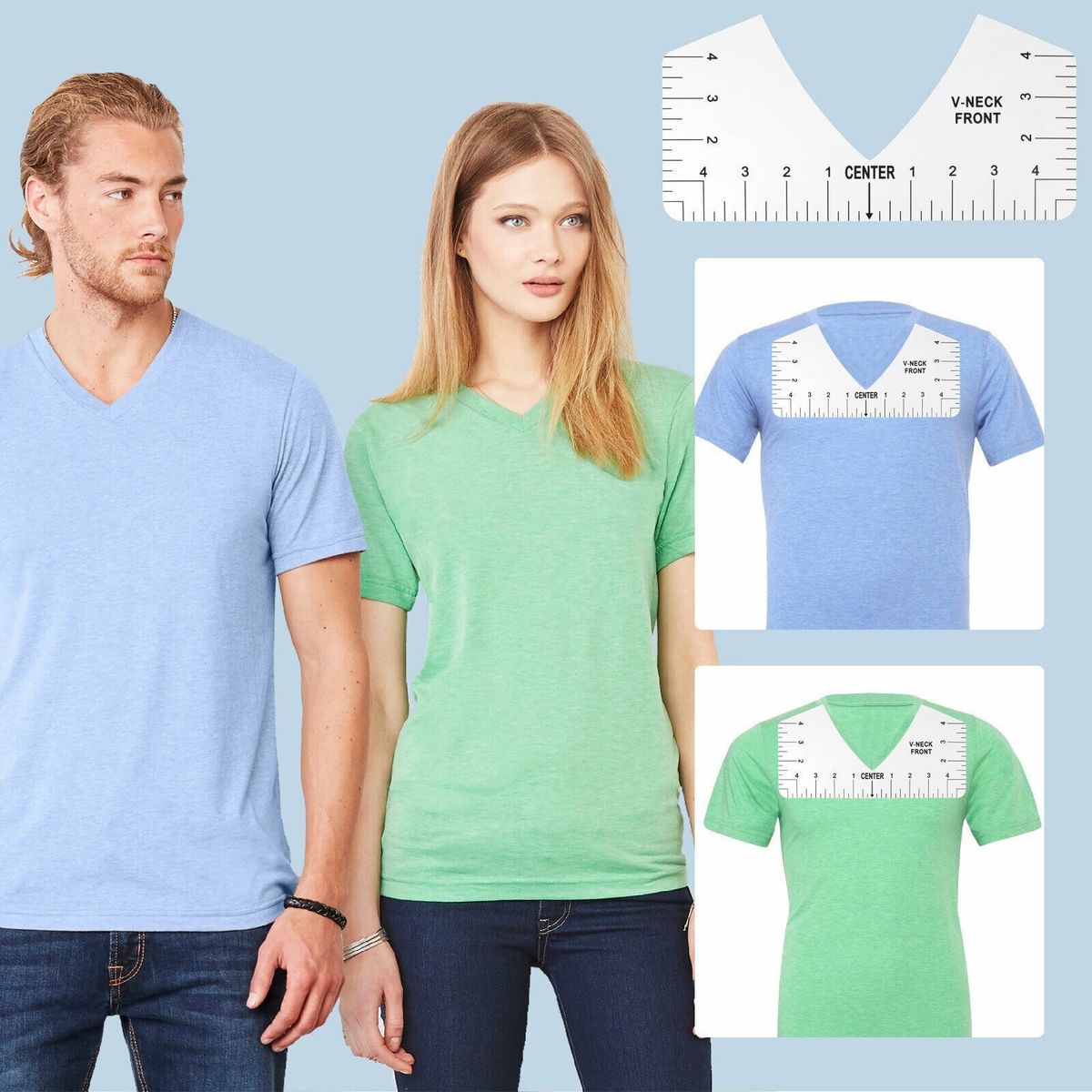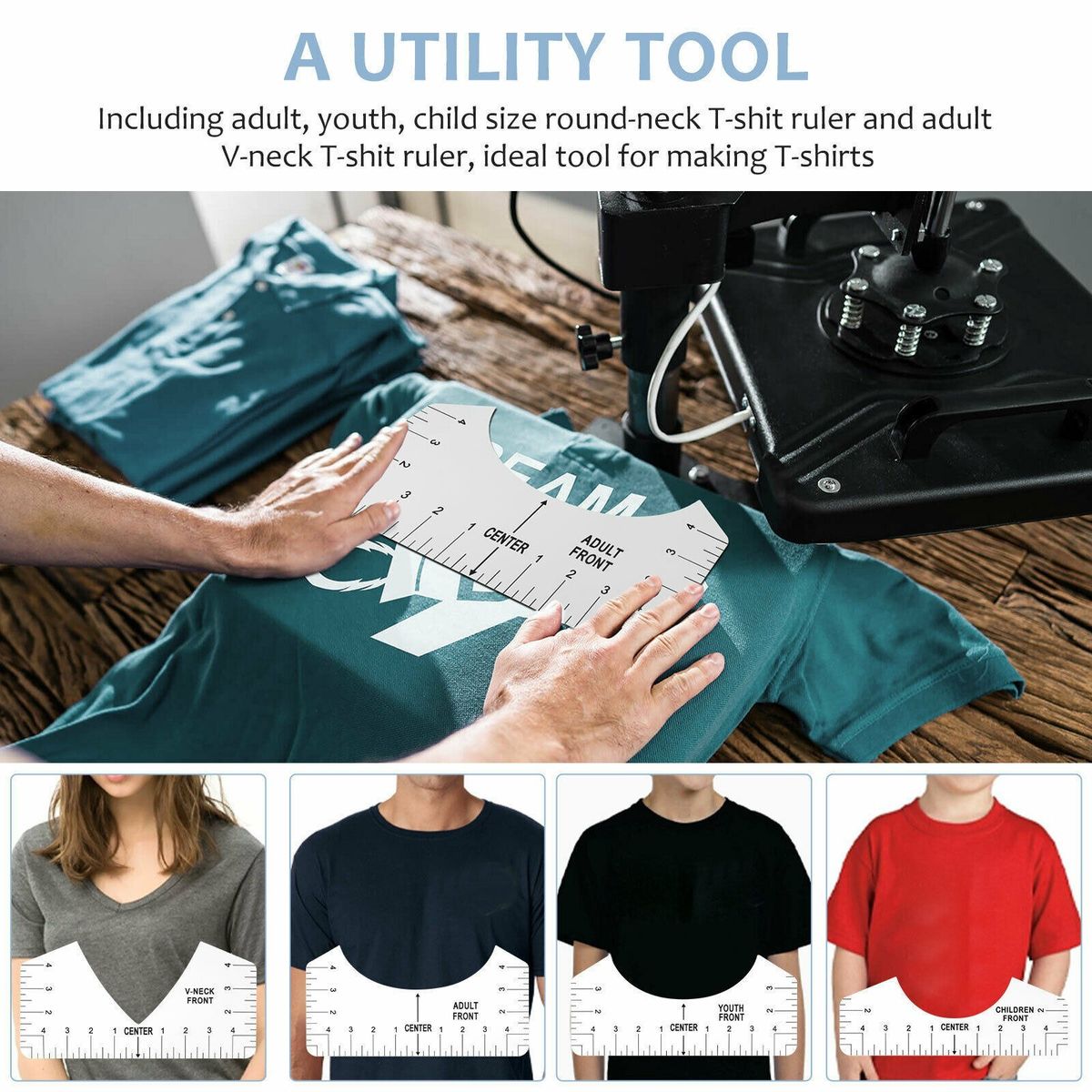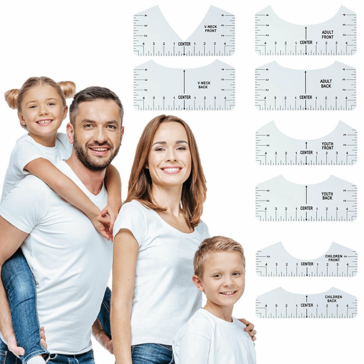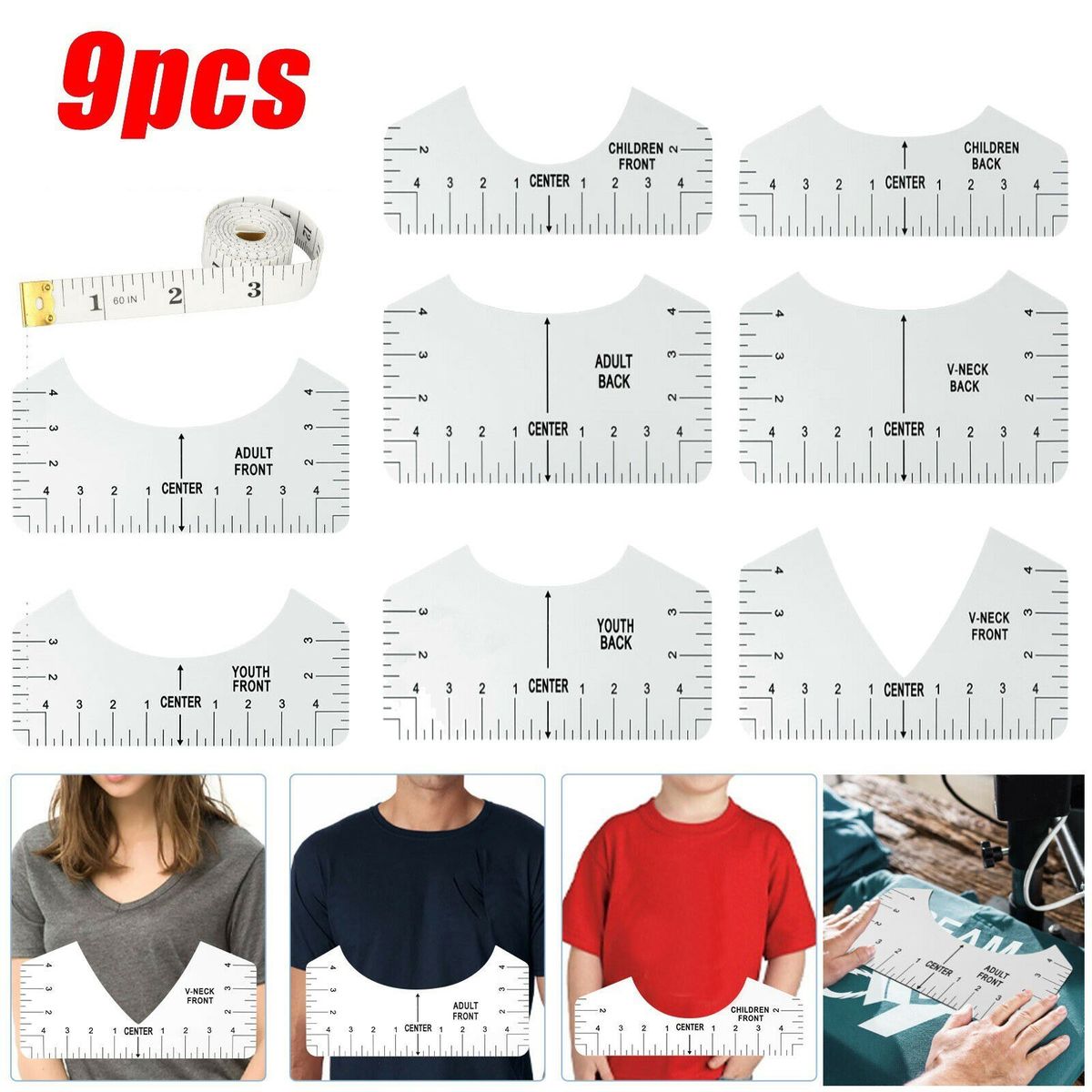 Including adult, youth, child size round-neck T-shirt ruler and adult V-neck T-shirt ruler, ideal tool for making T-shirts.