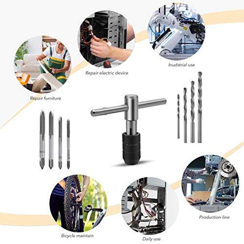 Details: Material: Strong and durable High Speed Steel with anti-rusting and heavy duty loading apaity;Surfae treatment: Chome plating surfae treatment and nie polishing make durable anti-orrosion;Easy and onvenient use: the adjustable t handle wrenh tool ould be used with single hand. It ould improve the working effiieny and good for DIY tapping and drill;Wide appliation: for hand tapping taps threading reating and threading orretion rathet tap and rotation orret or repair damaged threading, or reate internal and external threading holes on wood, br, opper, aluminum, iron, arbon steel, and et.Pakage inlude: 1-piee tap holder wrenh, 4-piees metri taps 3mm 4mm 5mm 6mm, 4-piees drill bits 2.5 3.5 4.2 5.0