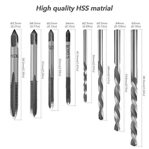 Pakage inlude: 1-piee tap holder wrenh, 4-piees metri taps 3mm 4mm 5mm 6mm, 4-piees drill bits 2.5 3.5 4.2 5.0