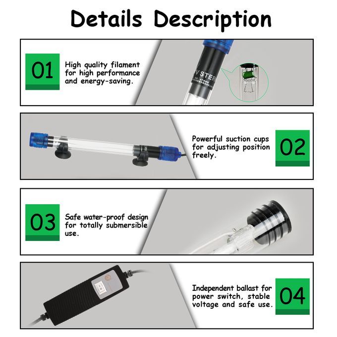 This product, with UV sterilization function, can ensure the fish tank clear and bright effectively. It's very simple for use and great for effects.