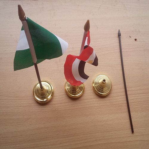 A 2-PC Pair Mini Polyester One Country UN Member A-C / Nigeria Table Top Flag Gold Base with a Stick Pole. Our Polyester Flags are made of High Quality Polyester material for the United Nations Member countries. The size is 4.25 X 6 inches table top flag with a plastic stick and golden base stand double-sided printing. The mini flag is suitable for both home and office to promote nationalism and for Meeting/Party/Office Decoration.