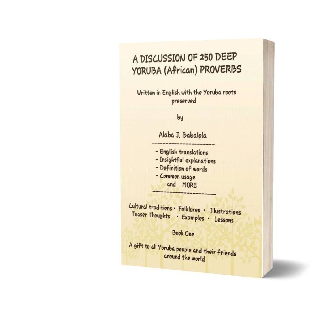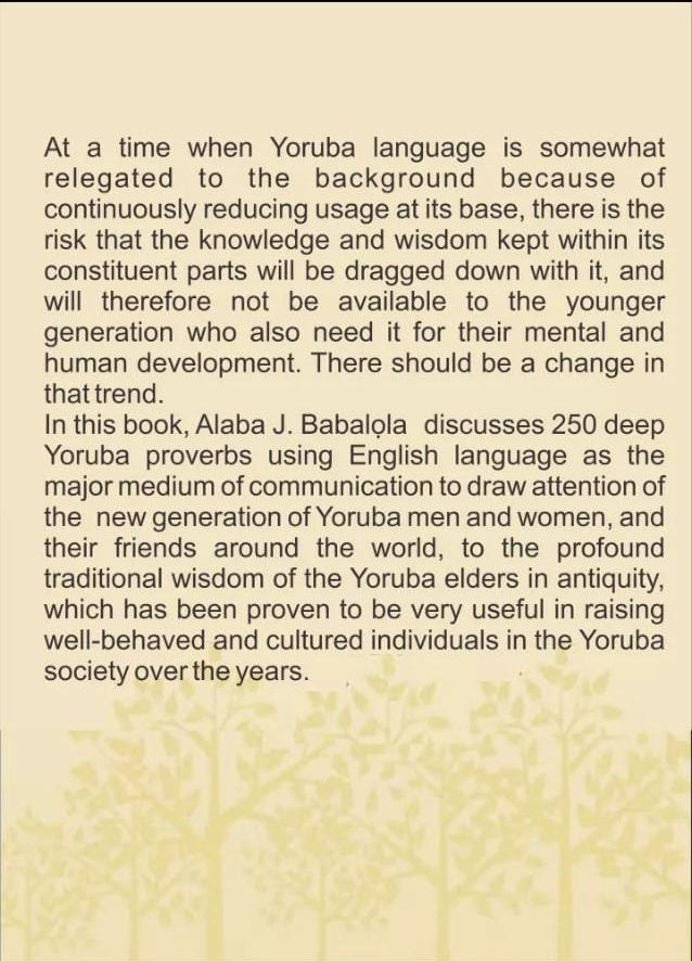 In this book, Alaba J. Babalola discusses 250 deep Yoruba proverbs using English language as the major medium of communication to draw attention of the new generation of Yoruba men and women, and their friends around the world, to the profound traditional wisdom of the Yoruba elders in antiquity, which has been proven to be very useful in raising well-behaved and cultured individuals in the Yoruba society over the years.