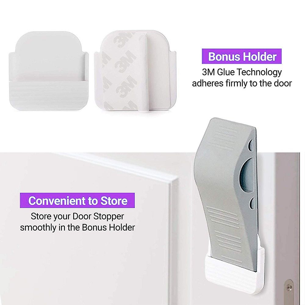 A Pair Of Door Stopper Rubber Door Stop 1 black and 1 white Door Stopper Rubber Door Stop Wedge Security Door Stops With Door Holder Rubber Door Stoppers Works On All Floor Types and Carpet Heavy Duty Door Jam. Your set comes with 2 free holder hooks to hang the product on any door and keep them safe and organized.Its colorful gift package makes it an thoughtful gift. Our unique sloped design and anti-slip base provide ultimate gripping power and allow your door stoppers to work on EVERY FLOOR surface.Furthermore, they can hold even the heaviest doors. Door stoppers measure L 4.8" x W 1.6" x H 1".They will fit under any of your doors hanging anywhere from 0.1 to 1 inch off the floor. Door stopper is made of premium quality TPR rubber which has features of high elasticity and high wear resistance and good slip resistance,so that it fits multi kinds of floors such as Wood Carpet Tile Laminate Concrete Floor,and it is non-toxic,do not worry if your baby put it in mouth. It is very easy to use this doorstop,insert the wedge door stop TIGHTLY into the gap between door bottom and floor,and pull back against the door stopper, please try reverse side(bottom up) to insert if it does not works properly, it is no need to drill a hole in wall or door to install it, what a house friendly gadget