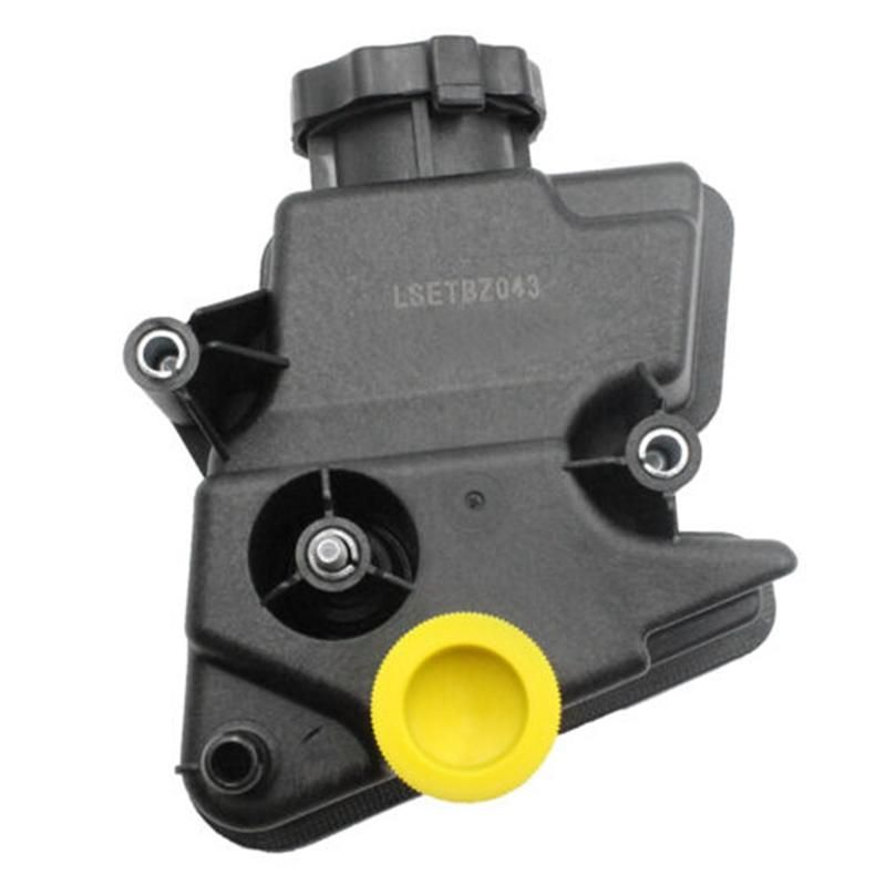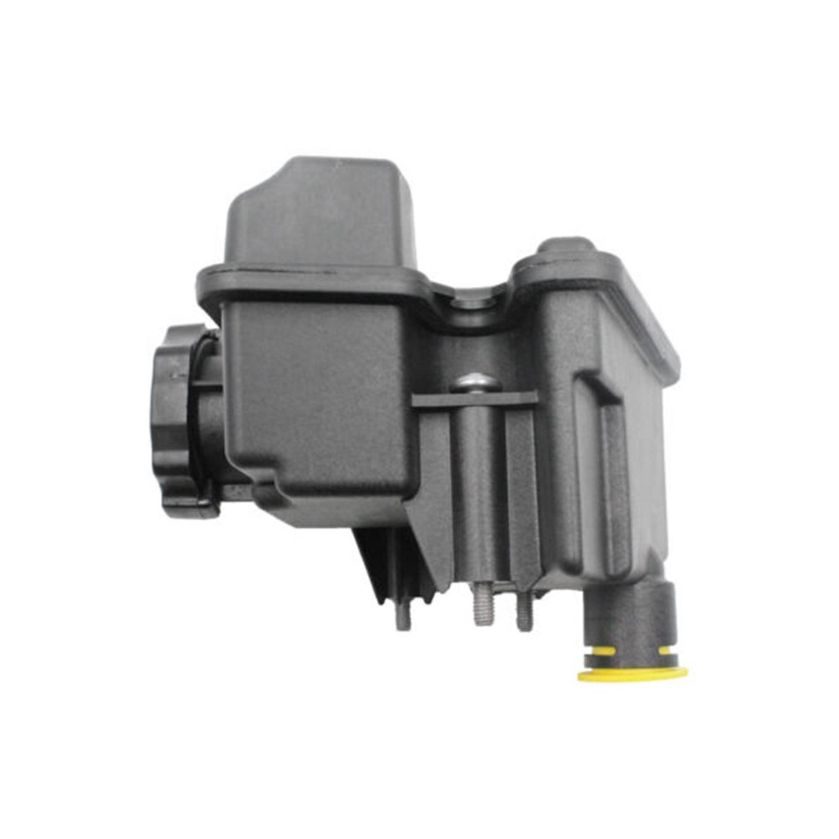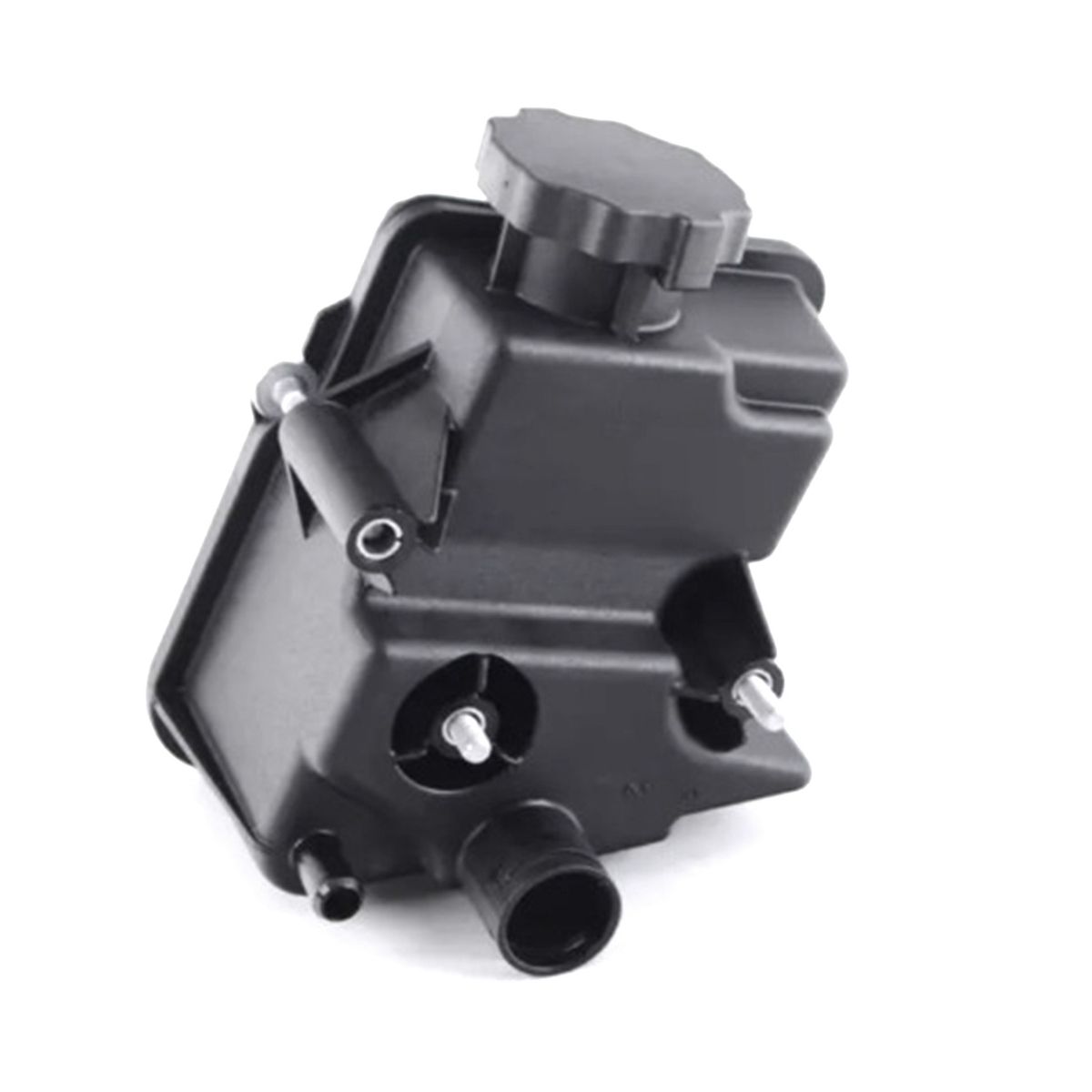 The power steering fluid reservoir is made of plastic which is durable stable and