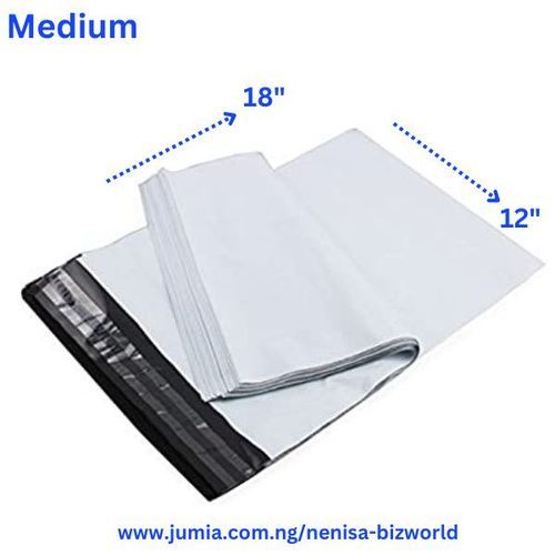 Tamper proof and self-adhesive courier bags / nylons, mailing bags or poly-mailer Shipping bags are widely used by e-commerce business, courier & logistics companies and other businesses. It has a white outer and black inner sides with an invoice pocket, to easily slip in your waybill details or Invoice. Size is Medium 12/18 Inches.