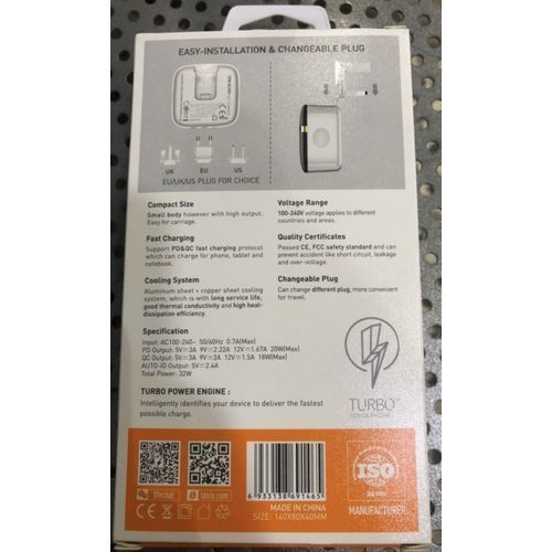 Best-in-Class Durable Design: Ultrasonic-wave stamping technology makes the 3 USB 32W Universal Fast Charger and Adapter pressure and shatter-resistant. It's also heat resistant up to 850°C.Keep Safe with Multi-Protection™: Proprietary Multi-Protection Technology includes 8 safety mechanisms to stop and prevent common electricity-related issues that could harm your device, including over-power and low voltage protection. CE, FCC, RoHS, and ISO-9001 Certified.3 High-Powered Outputs: The universal fast charger has 3 charge settings from 12W USB-A2 to PD 20W USB-C, so you can simultaneously charge multiple different devices quickly, like phone, tablet, and notebook.