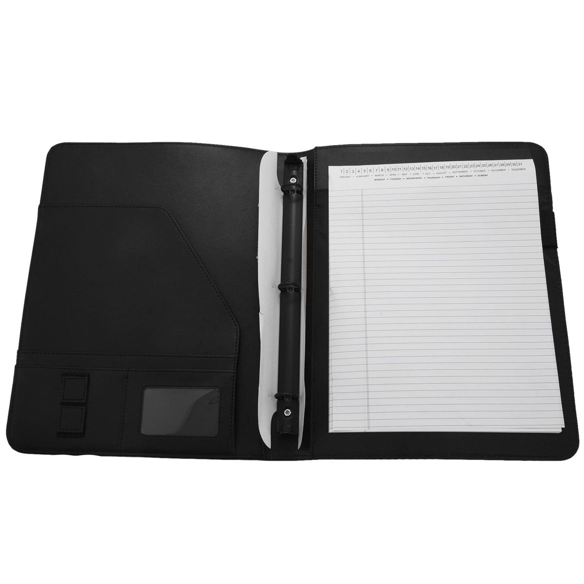 This padfolio includes, USB drive, business card holder, pad slot, letter size writing pad