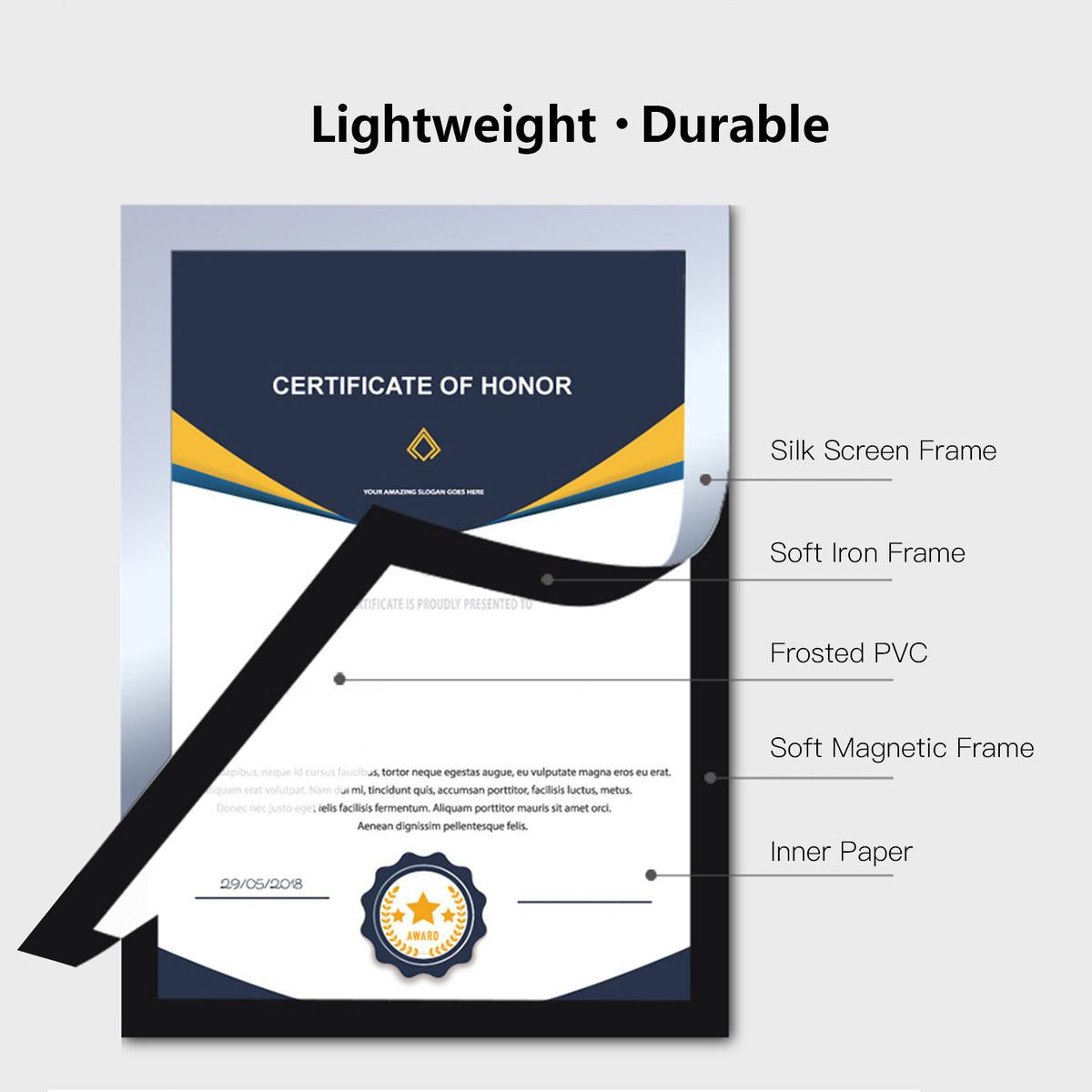 Soft magnetic frame, lightweight, durable and waterproof, easy to use.