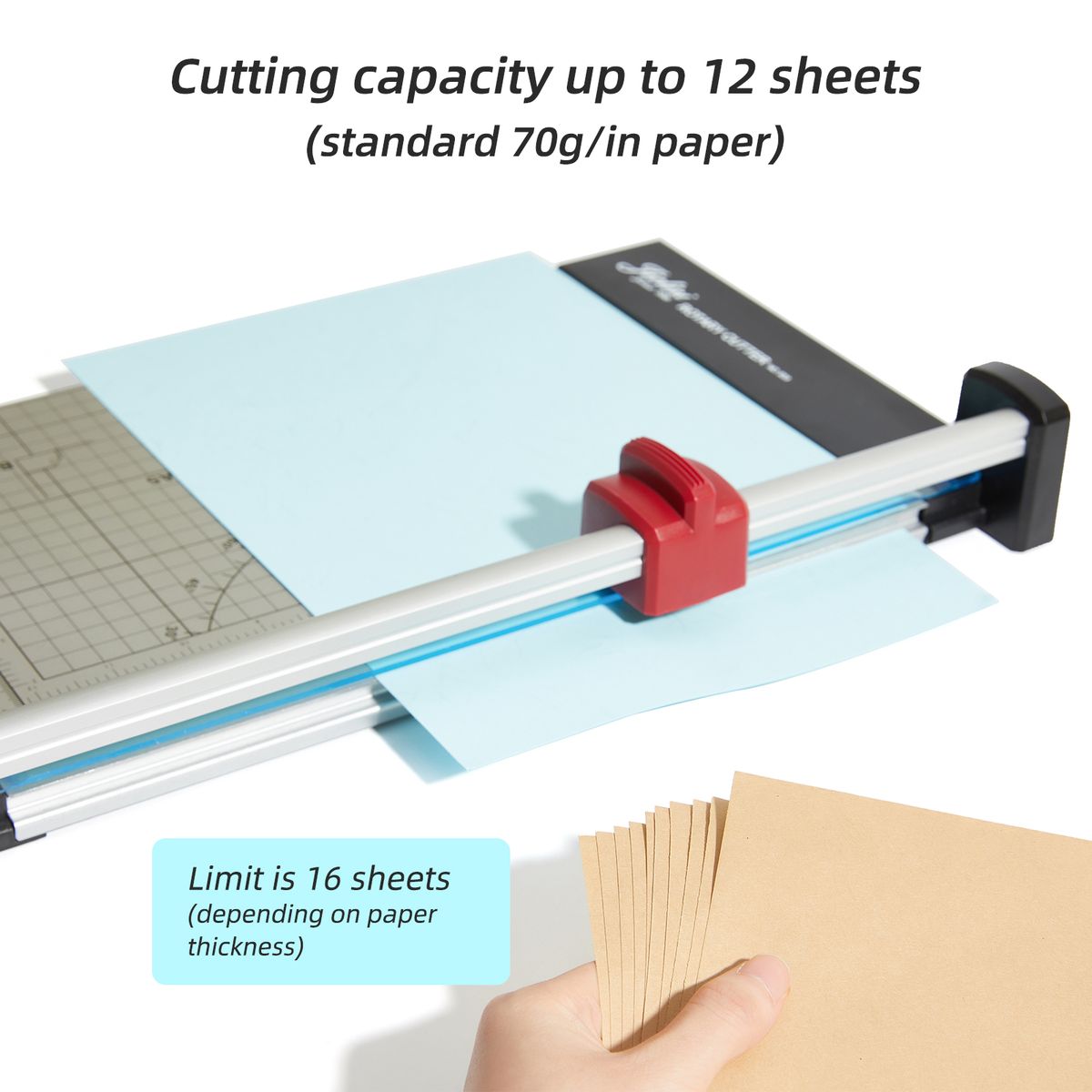 Firm and sharp cutter can cut up to 12 sheets, limit is 16 sheets (depending on paper thickness), perfect to use in high-volume projects.
