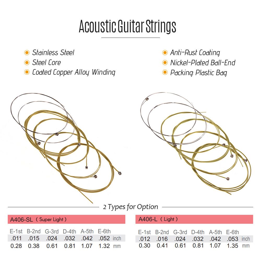 Note/Inch/MM: E-1st/.011/0.28; B-2nd/.015/0.38; G-3rd/.024/0.61; D-4th/.032/0.81; A-5th/.042/1.07; E-6th/.052/1.32 (A406-SL)