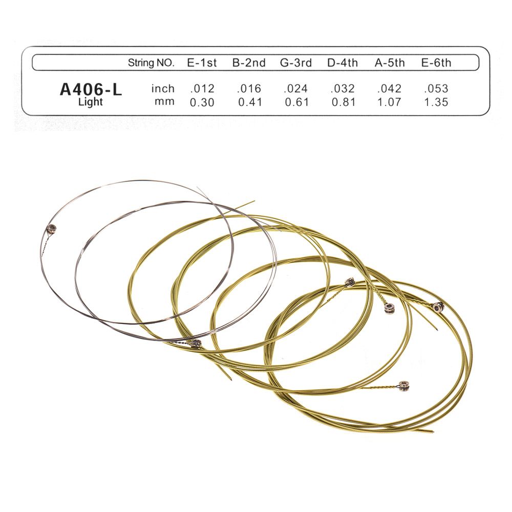 E-1st/.012/0.30; B-2nd/.016/0.41; G-3rd/.024/0.61; D-4th/.032/0.81; A-5th/.042/1.07; E-6th/.053/1.35 (A406-L)
