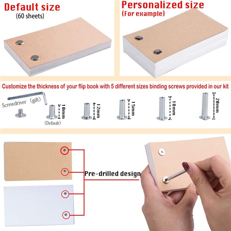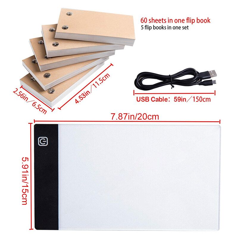 Feature:CARTOON FLIP BOOK KIT: With a A5 led light pad for drawing, premium quality 4.5x2.5inch 300 sheets flappable paper and different sizes binding screws for thickening your animation book, let's start to create your own cartoon flipbook now!STEPLESS BRIGHTNESS SETTING: Our A5 Flicker-Free Portable LED Light Box is anti-slip and STEPLESS adjustable, with advanced eyesight-protected technology, you can set brightness to your preference and no more sore eyes after long-hour using!ADJUSTABLE PERSONALIZED FLIPBOOK: Our kits come with 300 sheets Animation Paper and 5 different sizes of binding screws, allowing you to trace your art and make flipbooks of many different sizes!USB POWERED: Comes with a USB cable(1.5m) and a USB Plug, easily powered on/off via USB cable by plug into any USB port like computer, or USB Plug that connects directly into a wall outlet!START YOUR ANIMATION CRAFT: Premium LED made which is for stenciling, 2d animation, calligraphy, embossing, scrapbooking, tattoo transferring, sketch drawing etc.