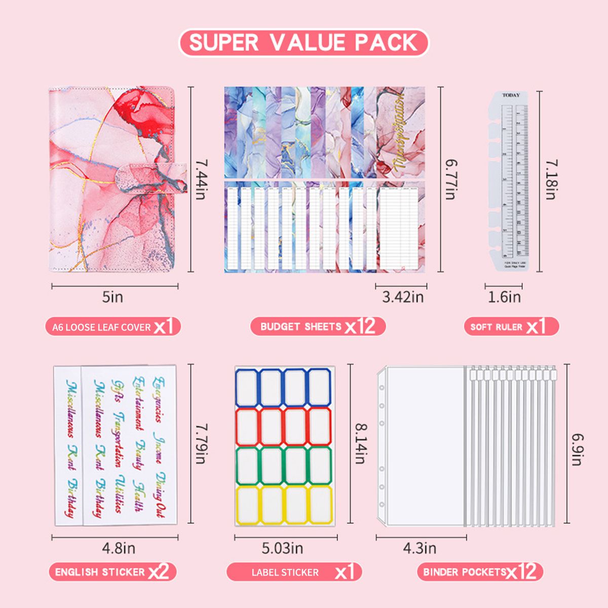 1 x A6 PU Leather Binder Cover,12 x Zip Pockets,12 x budget Sheets,2 x English word sticker sheets,1 x 16 label sticker in 4 colors,1 x Soft ruler