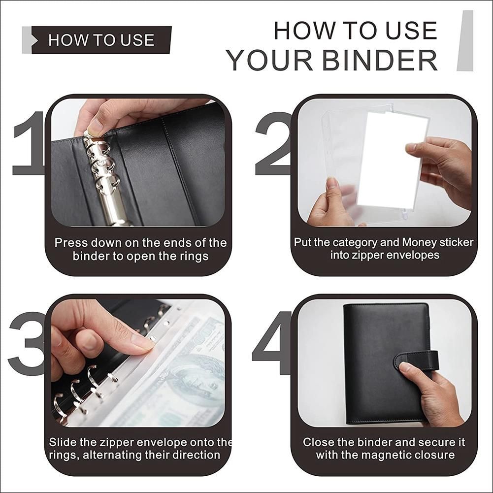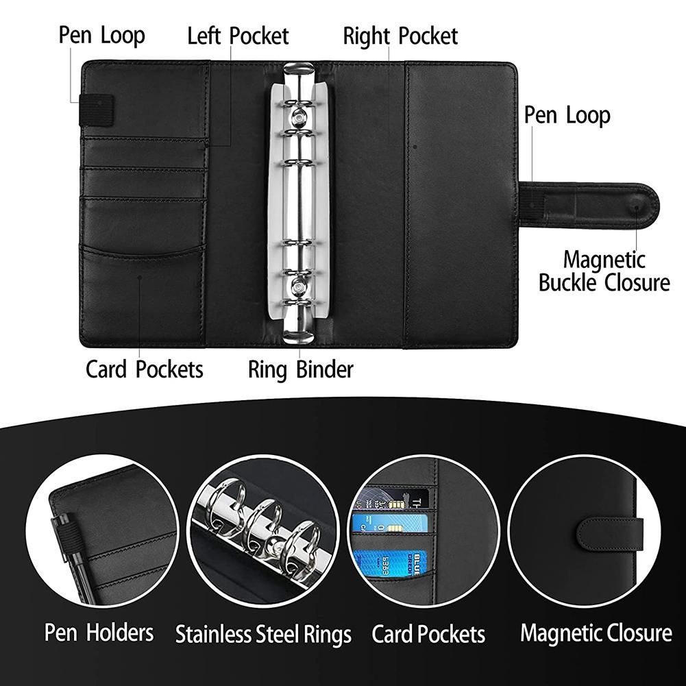 Durable Material:The notebook binder is made of PU+PVC, which is soft to Press and has natural grain and luster,Binder Pocket made from PVC material, the binder pockets features soft, tear resistance and waterproof, perfect for storing bills, invoice, cash, coupons, cards, stamps and more.