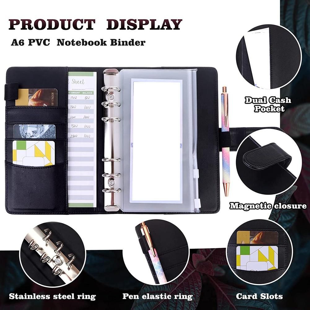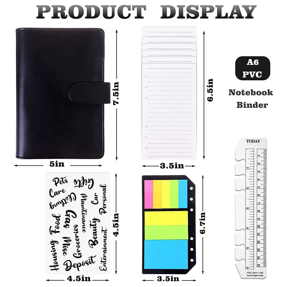 Package include:1pcs A6 PU leather notebook binder cover,12 pcs A6 6-holes binder pockets,50 pages 6-hole A6 loose leaf paper, 200 pcs colored neon page markers,5 colored self-adhesive labels, 1 pcs plastic ruler and 2 sheets sticker labels composed of 26 words, which will meet your various needs in daily budget, management, record and storage
