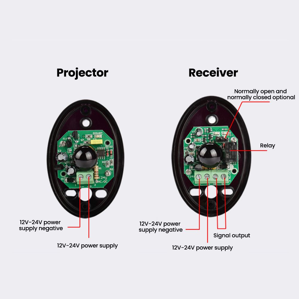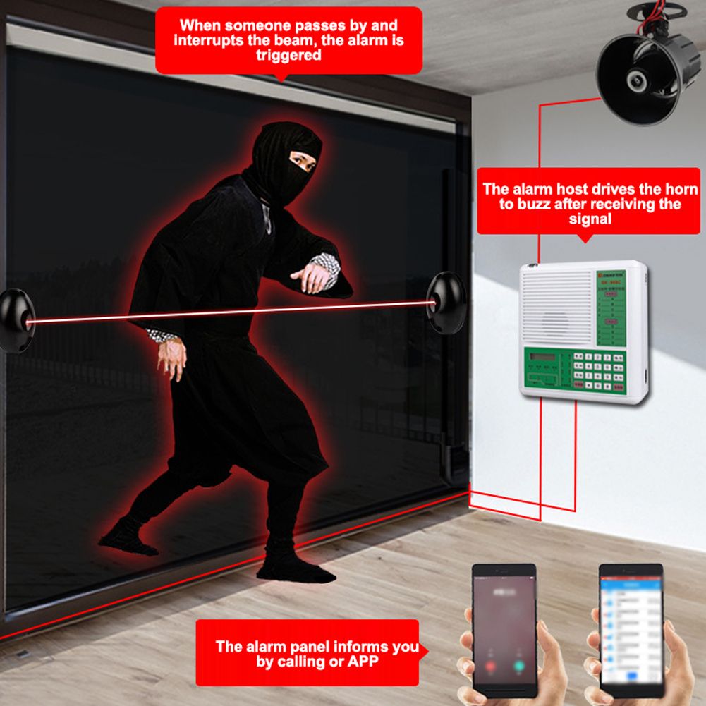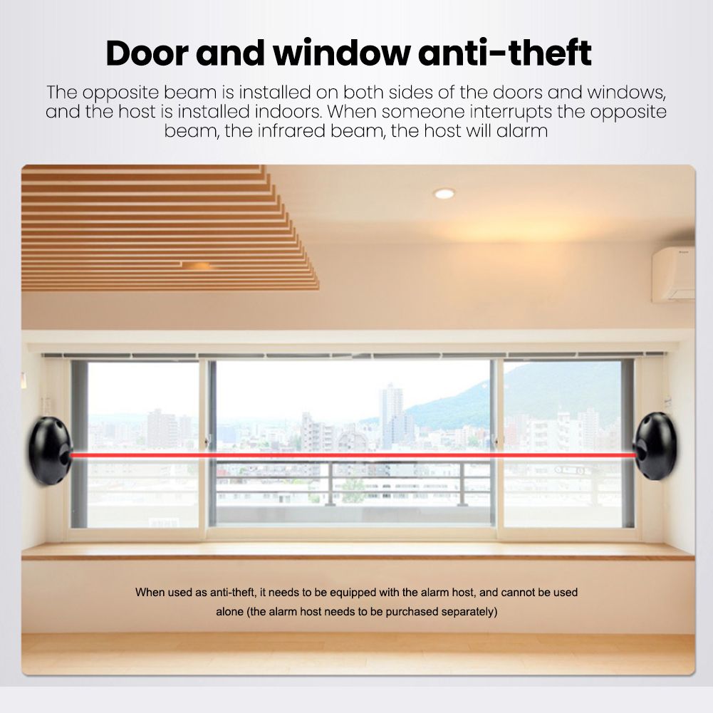 Installed then on both sides of doors and windows, and the host is installed indoors. When someone shuts off the infrared beam, the host will alarm. (Note: The host is NOT included, you need buy a host by yourself.)