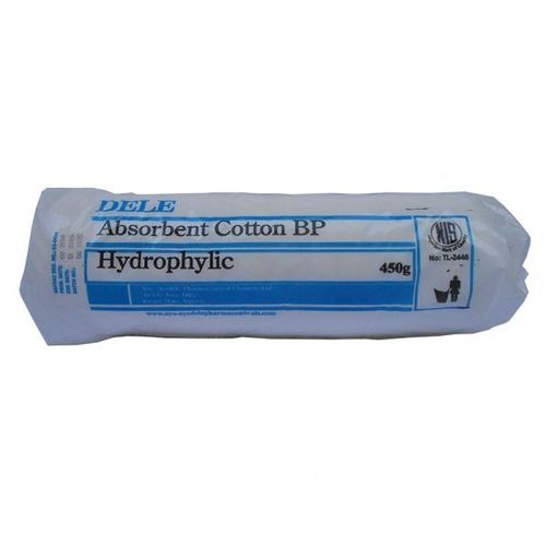 Dele Absorbent Cotton BP Hydrophilic 450g. A crucial material for Surgical and medical processes. It's Absorbent and hydrophilic with100% Cotton wool. The cotton can be used or processed in a variety of ways, to make cotton ball, cotton bandages, medical cotton pad and so on, can also be used to pack wounds and in other surgical tasks after sterilization. It is suitable for cleaning and swabbing wounds, for applying cosmetics. Economic and convenient for Clinic, Dental, Nursing Homes and Hospitals. Dele Absorbent Cotton BP Hydrophilic 450g is available in individual pack, in carton, Interleaved with paper and complies with BP. Dele Absorbent Cotton BP Hydrophilic 450g is packaged in cotton rolls of specified sizes.