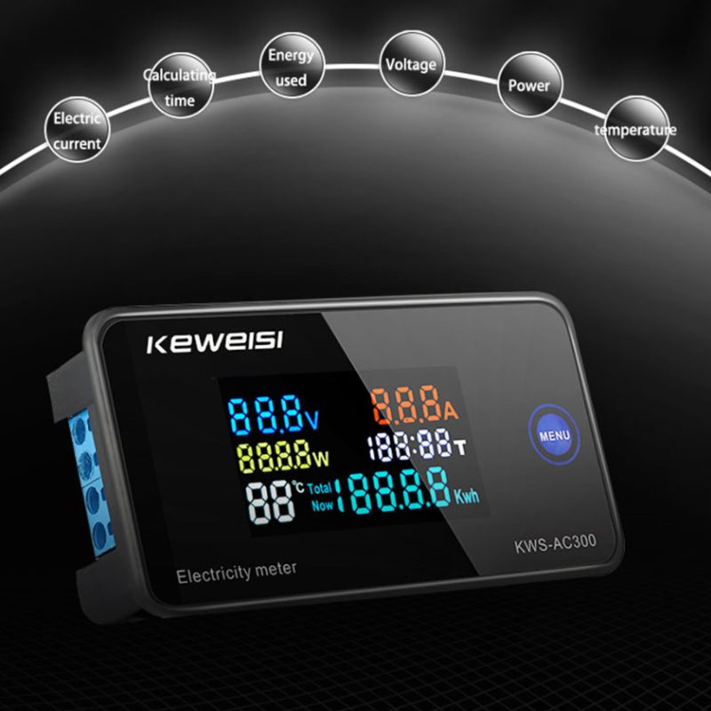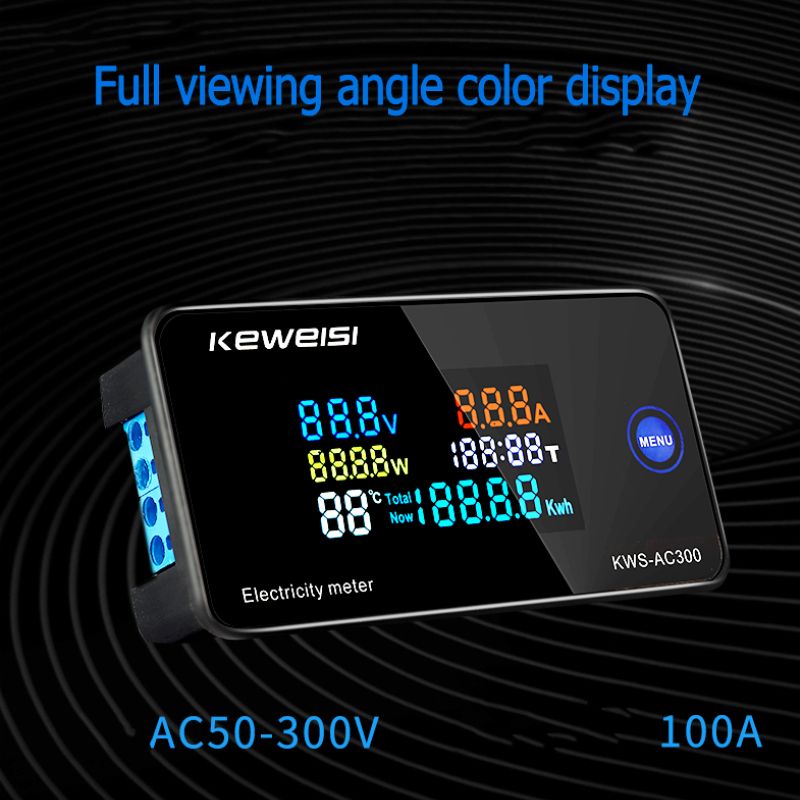 AC300-10A 1. Voltage: AC50-300V 2.Current: 0-10A 3.Power: 0-3000W 4.Capacity: 0.01-19999Kwh 5.Timing: 0-200H 6.Temperature: -10 ° C to 99 ° C 7.Package include: 1 *1 x Meter( 1 0A is without shunt/CT Coil) , 1*Usuer Manual 1*Temperature Sensor AC300-100A 1. Voltage: AC50-300V 2.Current: 0-100A 3.Power: 0-30KW 4.Capacity: 0.01-19999Kwh 5.Timing: 0-200H 6.Temperature:-10 ° C to 99 ° C Package include: 1 *1 x Meter 100A 1*Close CT / Split CT 1*Usuer Manual 1*Temperature Sensor Product Function: 1.Volage curent, power, iming. humilyCurrent electical energy,cumulative electrical energy 2. Electic energy and uming can be reset 3. Electic energy and iming have power down memory uncion 4. Rated frequency 45-65Hz Operating Instructions: Click the MENU on on the panel to view the current electrical energyandulative electrical energy. Electric energy and timing reset method: Pre and hold the MENU on for 5 seconds, the number in the timingarea will flash, then click the on to select timing, current electricalenergy andulative electrical energy reset. When the number flashes,double-click the on to reset. Pre and hold the on for 5 secondsto save the settings.
