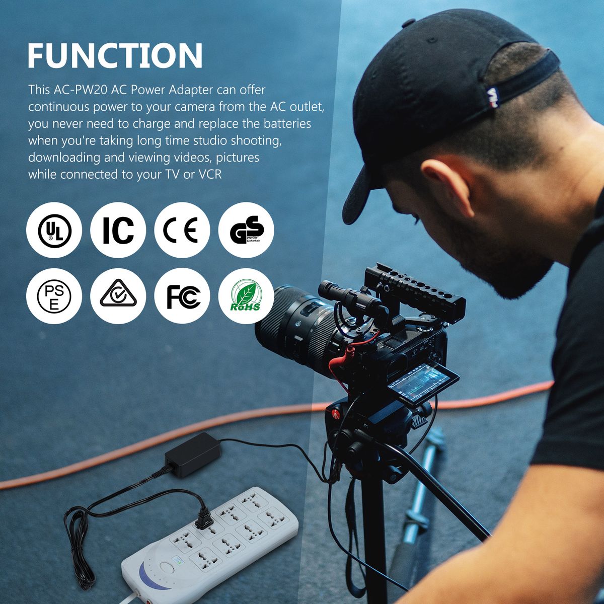 Function: This AC-PW20 AC Power Adapter can offer continuous power to your camera from the AC outlet, you never need to charge and replace the batteries when you're taking long time studio shooting, downloading and viewing videos, pictures while connected to your TV or VCR