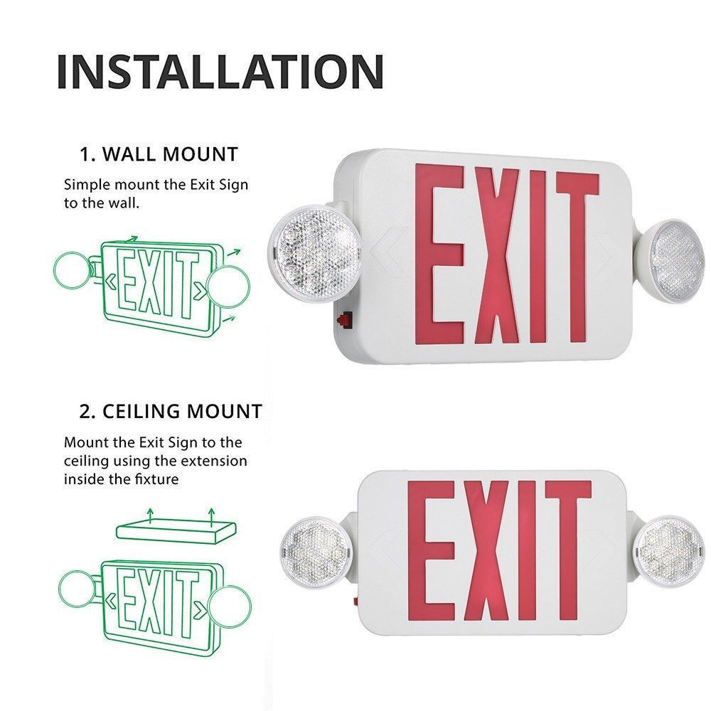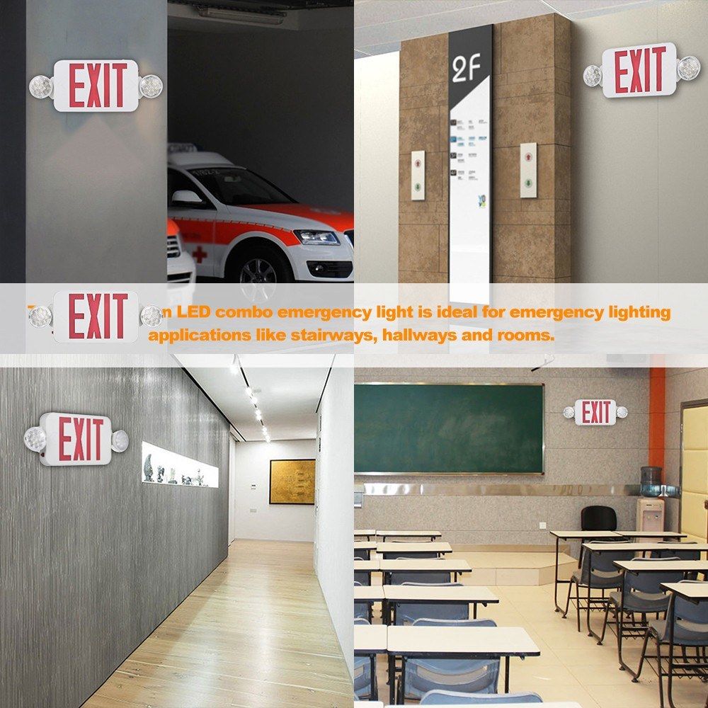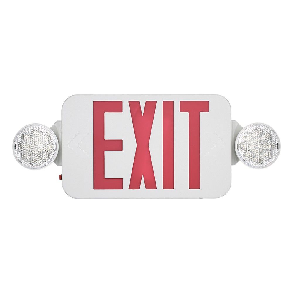 This red exit sign LEDs combo emergency light is ideal for emergency lighting applications like stairways, hallways and rooms. Ultra bright integrated LED\'s provide maintenance-free emergency lighting. Made of high impact thermoplastic, the housing is built to withstand harsh conditions.
