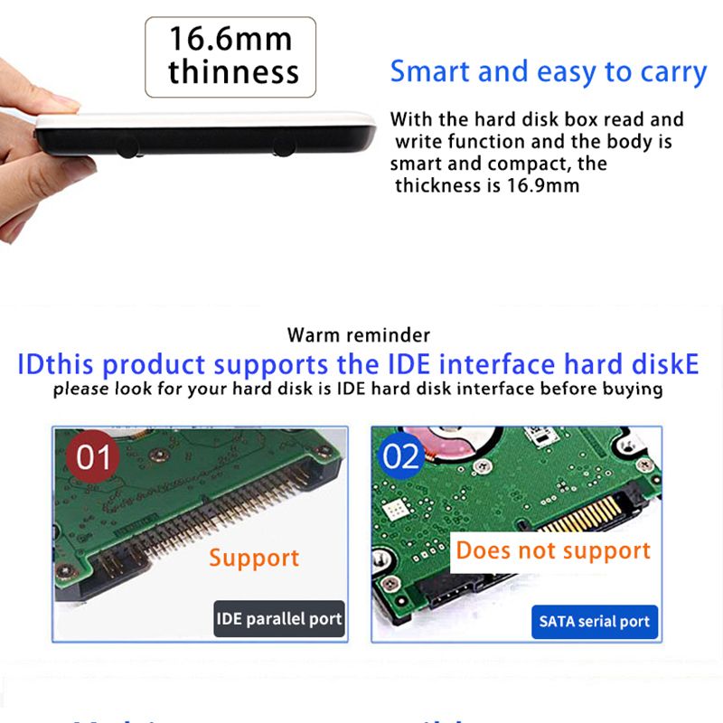 Ultra-high-speed transmiion of up to 480mbps The tool-free quick removal installation Multiple protection features, data security is not lost Exterior lightweight portable design Smart Ultra-compatible expansion capability: windows 98 (need to install the driver) / ME / 2000 / XP / Vista and Linux syst. colour: material:plastic size:13.5x85x16.9cm Package Contents: 1 * Hard Disk Enclosure 1 * Data cable 1 * EVA pad Only the above package content, other products are not included. Note: Light shooting and different displays may cause the color of the item in the picture a little different from the real thing. The measurement allowed error is +/- 1-3cm.
