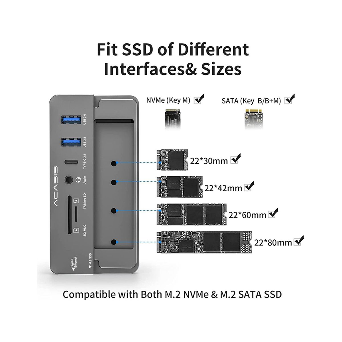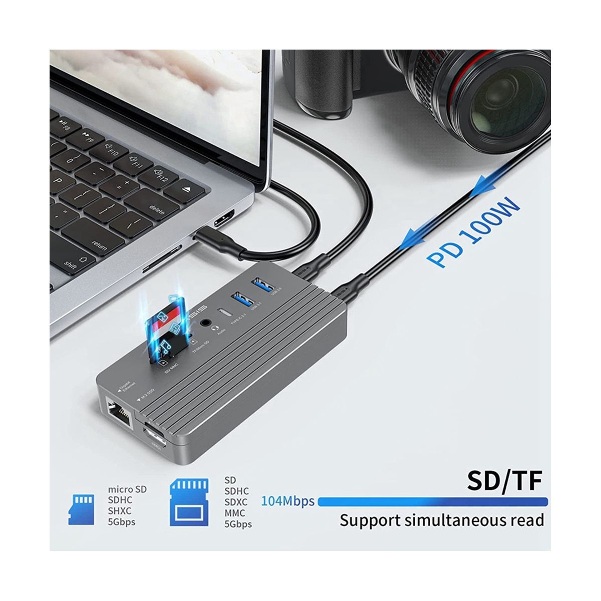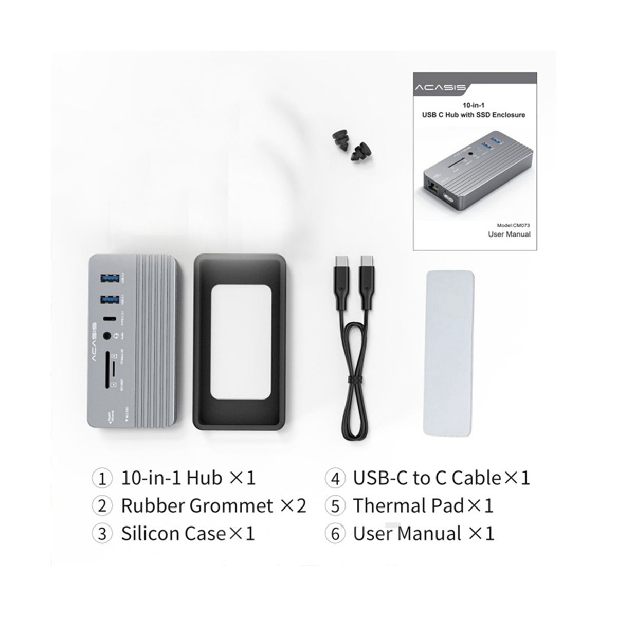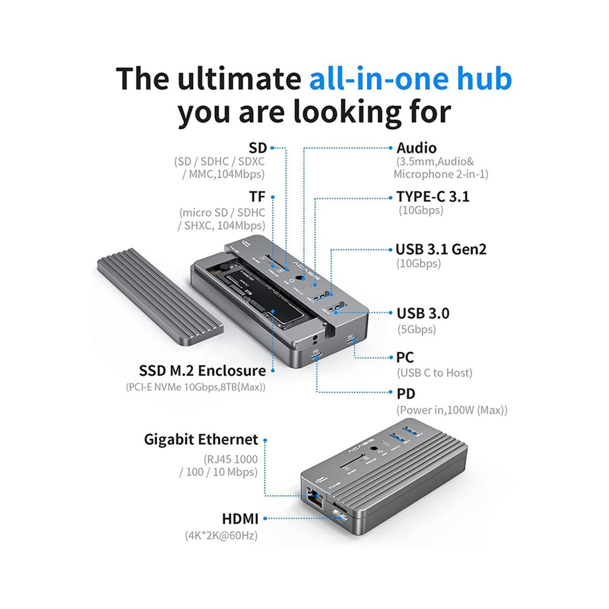 Massive 10 ports Expansion M2 NVMENGFF SATA SSD enclosure with max 8T capacity Power Delivery up to 100W up to 4K@60Hz HDMI SDTF card readers 1 USB-C 10Gbps port 1 USB-A 10Gbps port 1 USB-A 5Gbps port 35mm Audio & Microphone