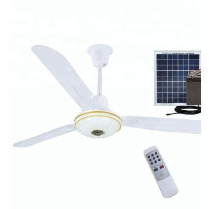 Power supply: 12V DCPower input: 36 & plusmn;5WRated current: 3ARotation speed: 320 & plusmn;10rpm(Max.)Blade span: 1400mm & plusmn;3%Recommended solar panel: 15~18V, 45W~50WMore than 30000 hours life motor in high efficiency56" blade span,perfect for most rooms100% copper brushless motor, energy saving motor20 settings of fan speedmetal blades with strong wind and low noiseWith remote control