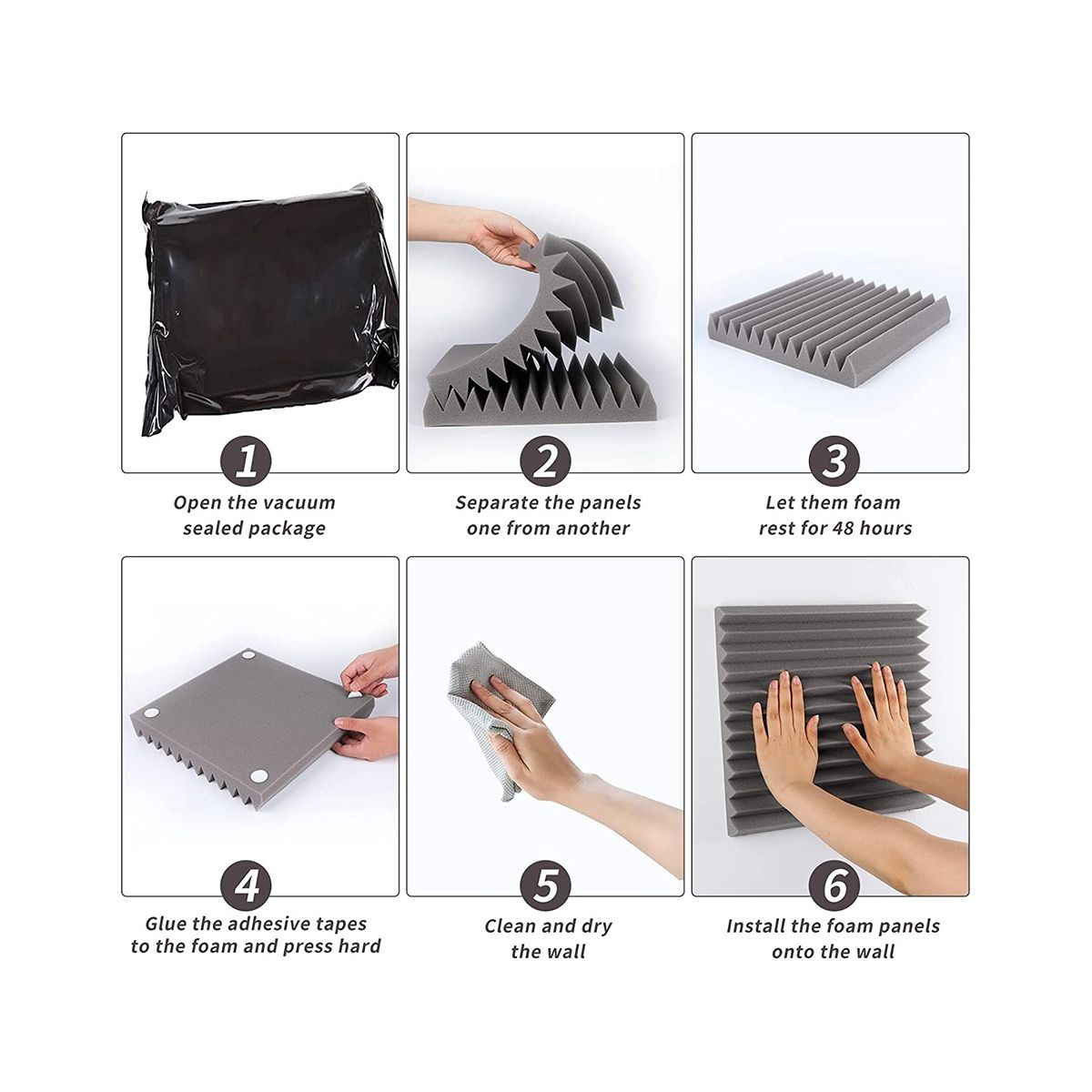 EASY TO INSTALL acoustic foam panels are lightweight and can be installed to a of different surfaces walls doors windows etcIn case you need to fit noise dampening panels in a smaller or an odd-shaped area you can trim as needed with regular scissors Installation can be be done using adhesive tape or spray not included or you can use push pins or Buckle to hang acoustic wall panels temporarilyThese panels great room treatment are easy to install
