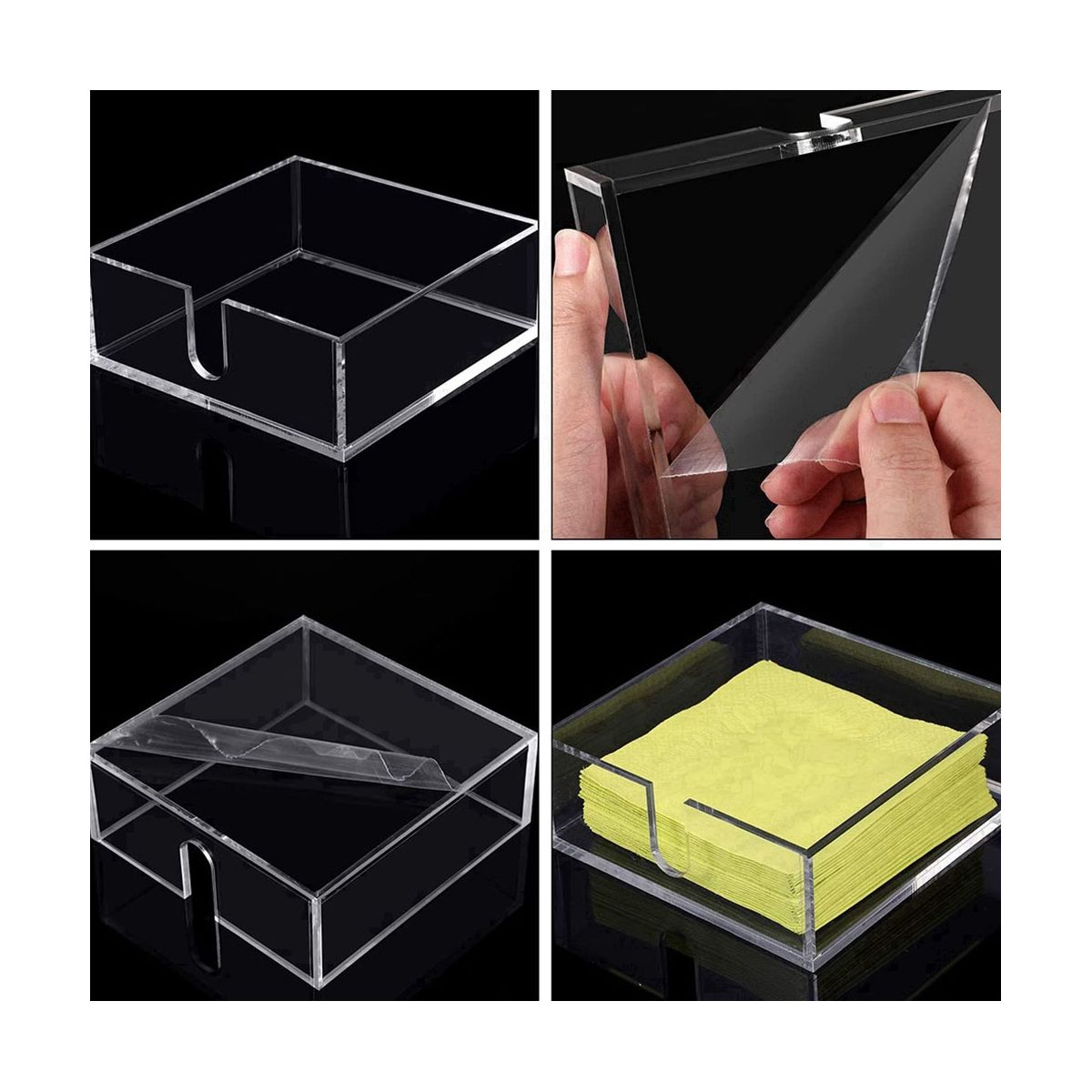Convenient design: napkin holders are made of a durable acrylic material, 5 mm in thickness; There is an u-shaped opening on the side of the napkin holder, so that you can use a piece of napkin at a time to to the place, convenient to use, easy to keep the napkin clean and tidy